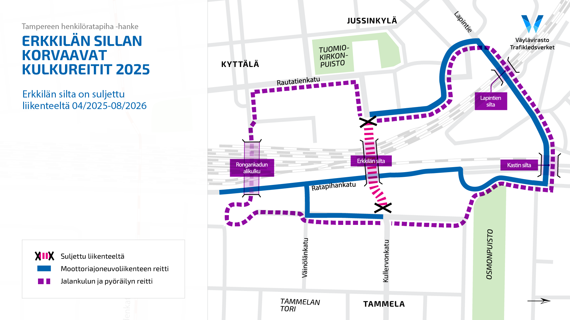 Asematunneli: Rautatieaseman pohjoispuolella sijaitseva vain jalankulkijoiden käytössä oleva tunneli. Suljetaan koko hankkeen ajaksi alkaen 7.4.2025.