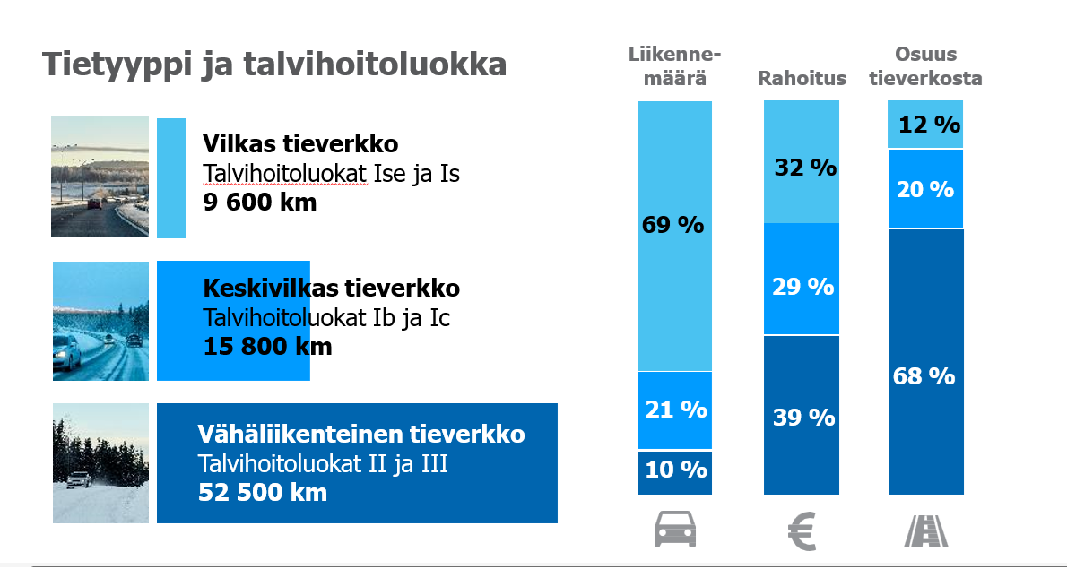 ”Alimmissa talvihoitoluokissa keli voi sään muuttuessa olla useiden tuntien ajan ongelmallinen, jolloin tienkäyttäjiltä vaaditaan erityistä varovaisuutta. Kahteen alimpaan luokkaan kuuluu yli kaksi kolmasosaa maanteiden yhteispituudesta, mutta vain kymmenen prosenttia kaikesta liikenteestä”, Pirinen toteaa.