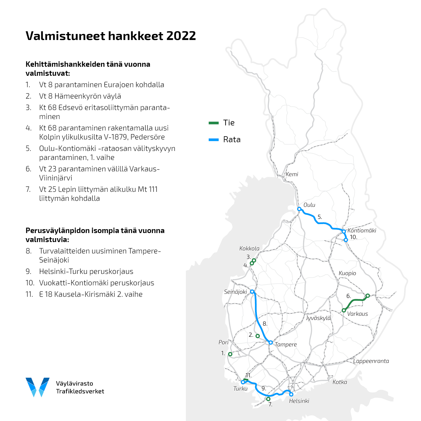 Tänä vuonna valmistui yhteensä seitsemän kehittämishanketta. Perusväylänpidon puolelta valmiiksi saatiin neljä isompaa hanketta.