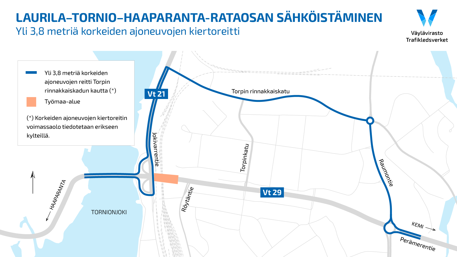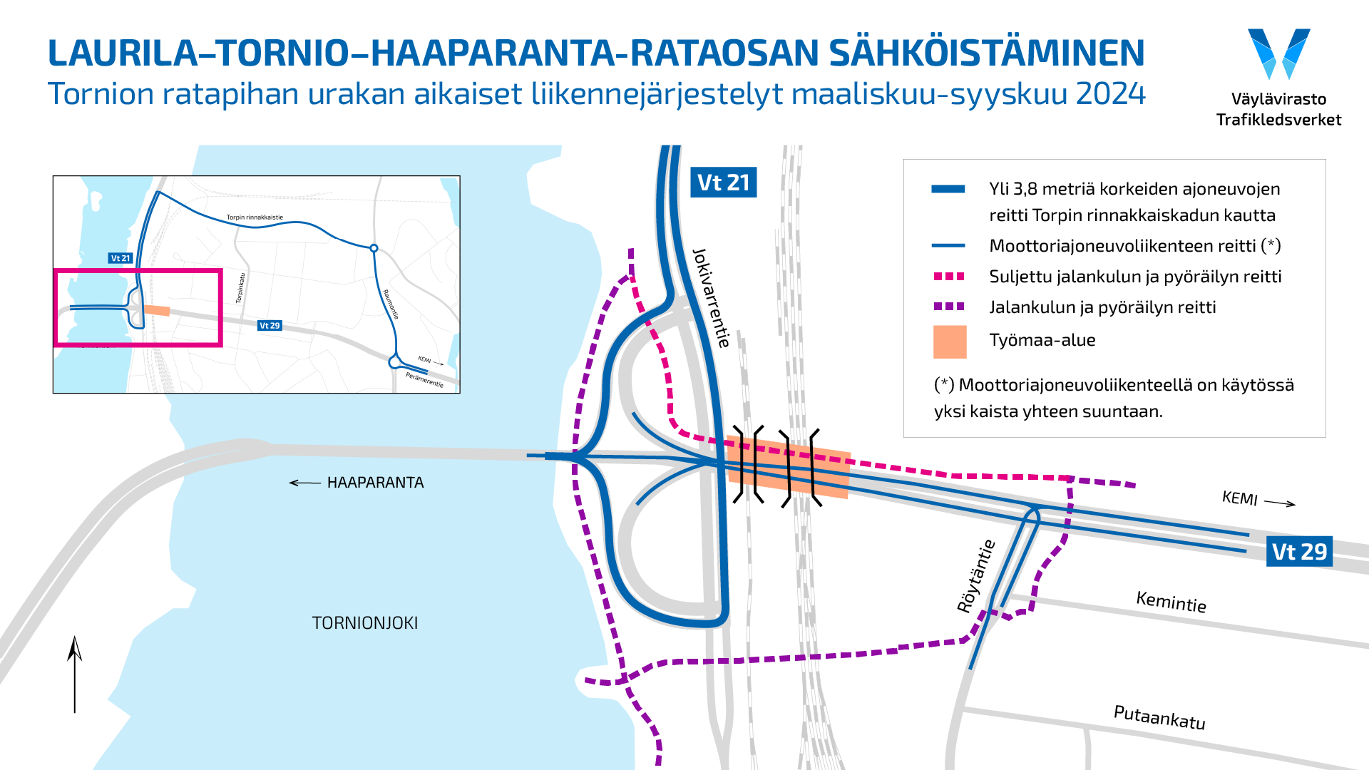 Torniossa ratapihan rakentamisurakkaan kuuluvat siltojen korjaus- ja purkutyöt aiheuttavat muutoksia liikenteeseen maaliskuusta syyskuuhun. Muuttuvat liikennejärjestelyt koskevat moottoriajoneuvoliikennettä sekä jalankulkijoita ja polkupyöräilijöitä. Tornion ratapihan rakentamisurakka on osa Väyläviraston Laurila−Tornio−Haaparanta-rataosan sähköistämishanketta.