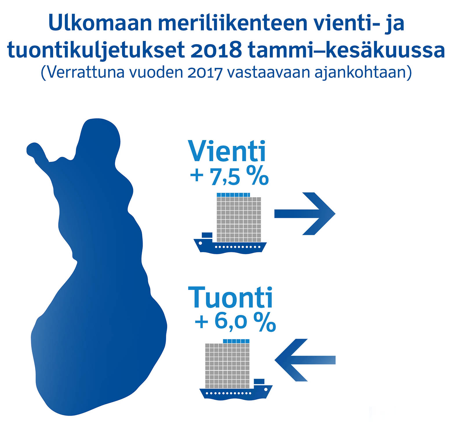 Ulkomaan meriliikenteen vienti- ja tuontikuljetukset kasvoivat tammi-kesäkuussa edellisen vuoden vastaavaan ajankohtaan verrattuna. Vientikuljetukset kasvoivat 7,5 prosenttia ja tuonnissa oli kasvua 6,0 prosenttia vuoteen 2017 verrattuna.