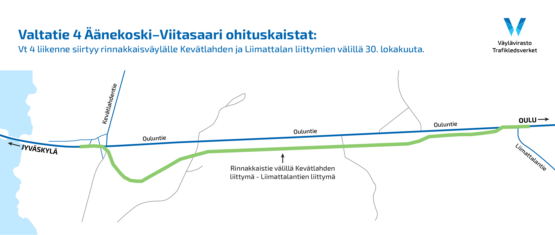 Valtatie 4:n liikenne siirretään kulkemaan uudelle rinnakkaistielle Kevätlahden liittymän ja Liimattalan liittymän välillä Äänekosken pohjoispuolella. Liikenteen siirto tapahtuu 30. lokakuuta 2023 klo 15 mennessä.