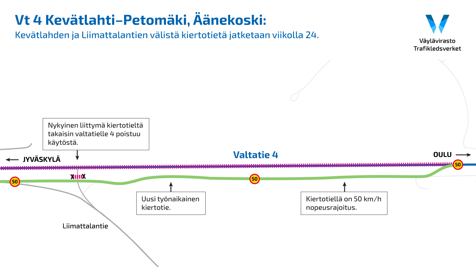 Kiertotietä jatketaan Liimattalantien risteyksestä eteenpäin valtatien 4:n itäpuolella Petomäkeen saakka. Noin kilometrin pituinen pidennys otetaan käyttöön 10.6. alkavalla viikolla.