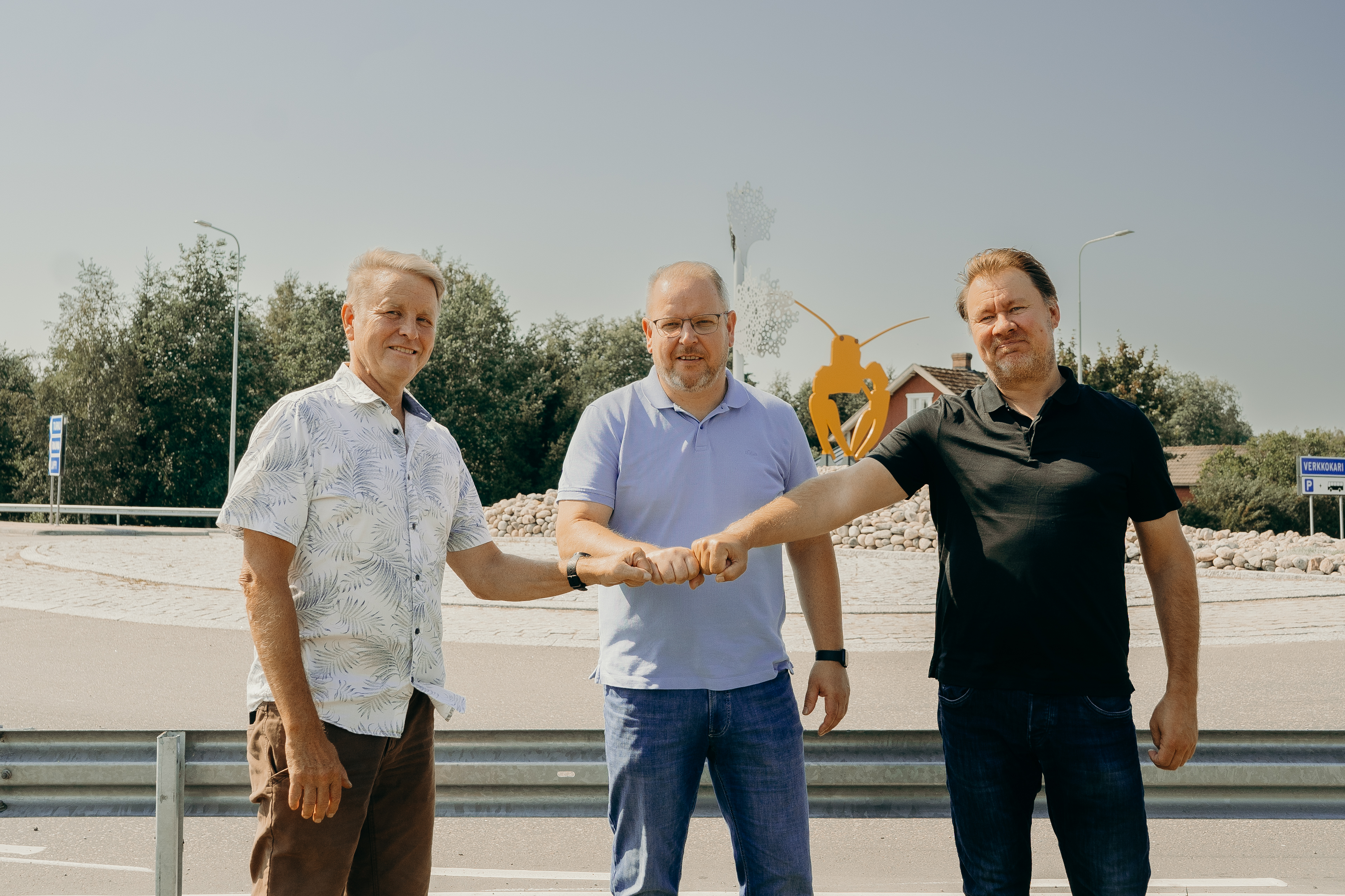 Kuvassa vas. projektipäällikkö Kari Partiainen Väylävirastosta, Eurajoen kunnanjohtaja Vesa Lakaniemi ja tekninen johtaja Sami Nummi. Taustalla uusi Eurajoen portin kiertoliittymä.