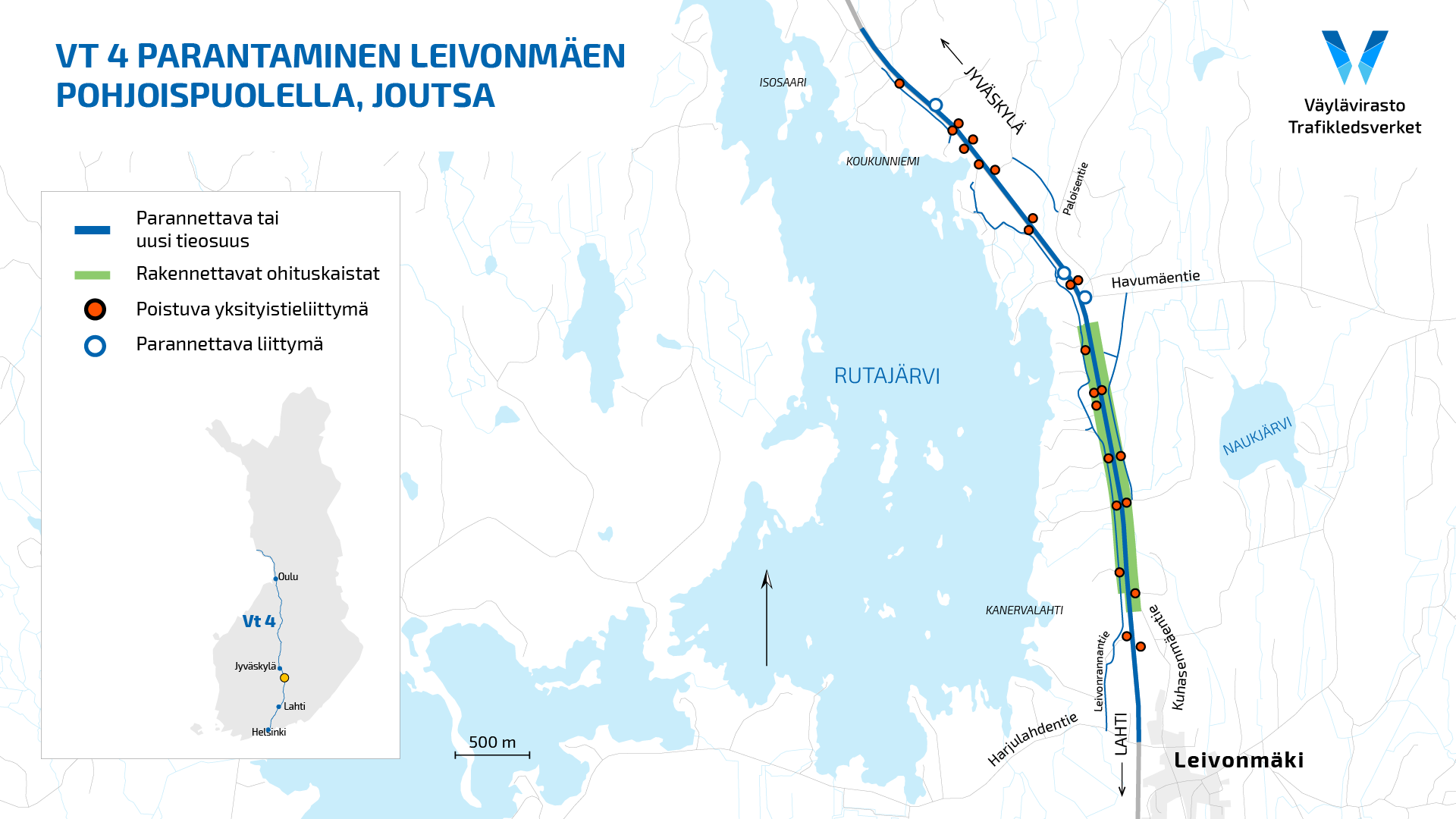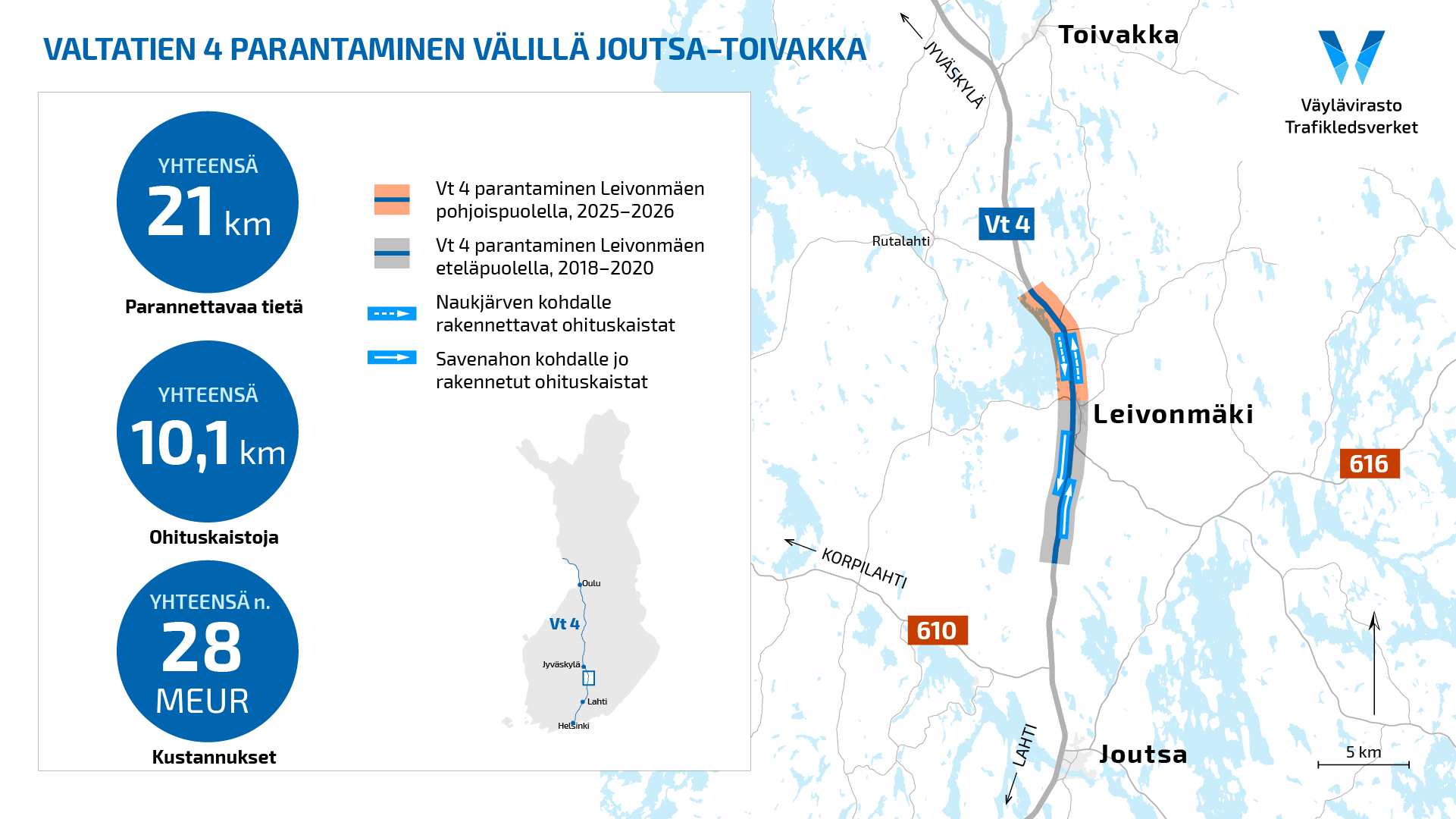 Valtatien 4 parantamista Jyväskylän ja Joutsan välillä jatketaan seuraavaksi rakentamalla ohituskaistat Leivonmäen pohjoispuolelle Joutsassa sekä rampit Oravasaaren eritasoliittymään Jyväskylässä. Merkittävimpiä vaikutuksia ovat liikenneturvallisuuden sekä liikenteen sujuvuuden paraneminen. Töiden aikataulu tarkentuu syksyllä.
