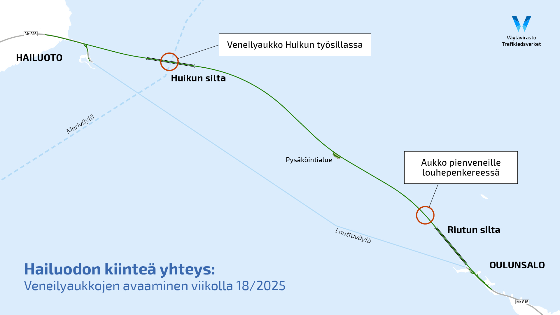 Hailuotoon rakennetaan nykyisen lauttayhteyden korvaava kiinteä maantieyhteys Oulun Riutunkarin ja Hailuodon Huikun välille. Noin 8,4 km pitkä kiinteä yhteys sisältää pengertieosuuden ja Huikun ja Riutun pitkät sillat. Kiinteällä yhteydellä parannetaan Hailuodon valtakunnallista ja seudullista saavutettavuutta. Yhteys mahdollistaa entistä sujuvammat yhteydet Hailuotoon suuntautuvalle henkilö- ja tavaraliikenteelle sekä paikalliselle elinkeinotoiminnalle ja laajentaa Hailuodon työssäkäyntialuetta. Yhteyden rakentaminen vie kokonaisuudessaan noin kaksi ja puoli vuotta. Tavoitteena on, että Hailuodon kiinteä yhteys on käytössä loppuvuodesta 2026.