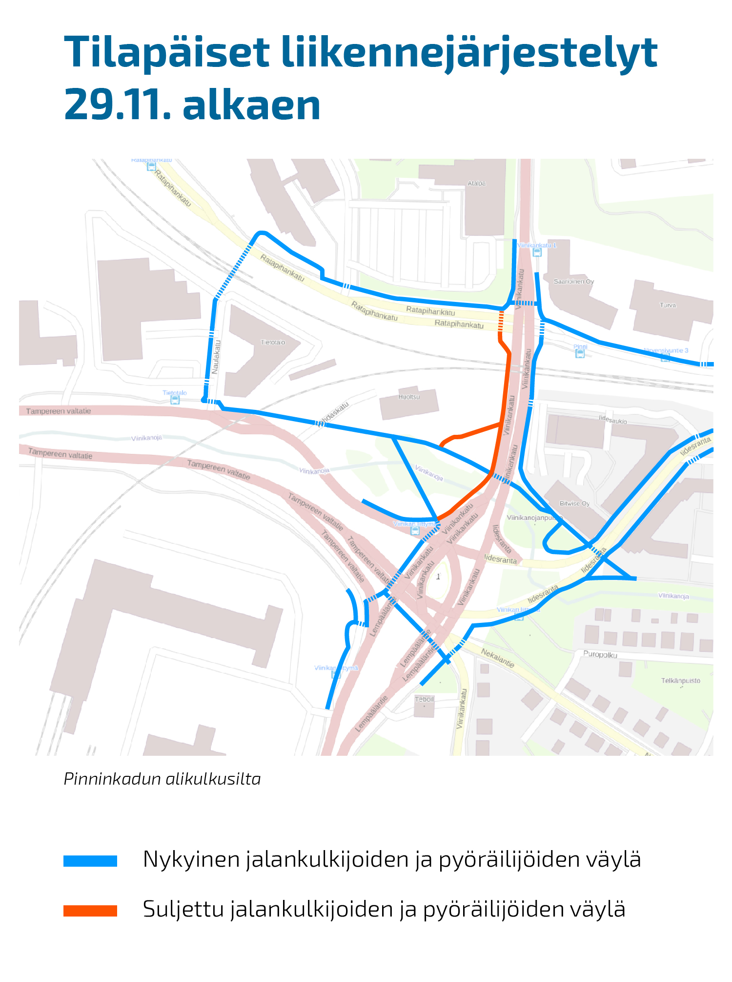Viinikankadun länsipuolen jalankulun ja pyöräilyn väylä suljetaan Viinikan liittymän ja Ratapihankadun väliseltä osuudelta perjantaista 29.11. alkaen. Tilapäinen liikennejärjestely liittyy Viinikankadun ylittävän rautatiesillan (Pinninkadun alikulkusilta) rakentamiseen ja on voimassa elokuuhun 2020 saakka.