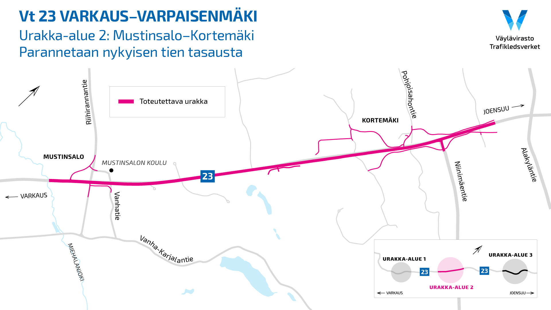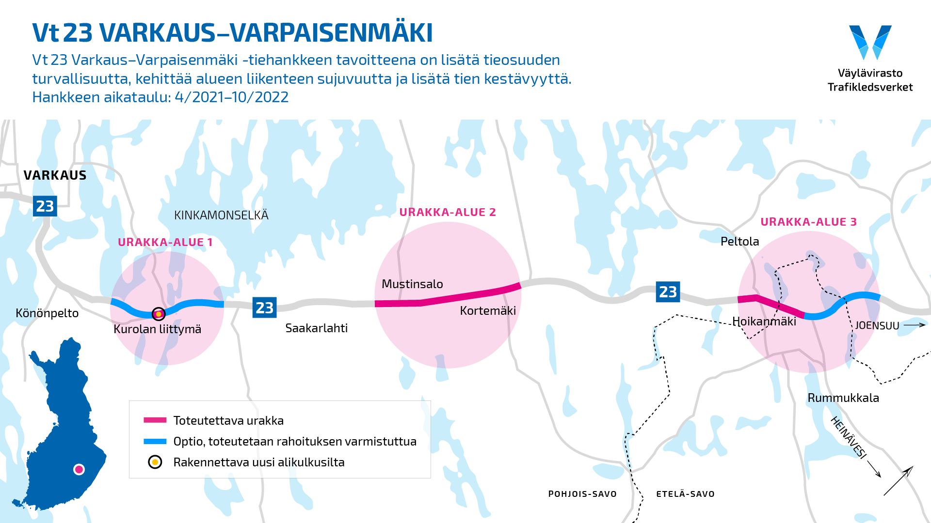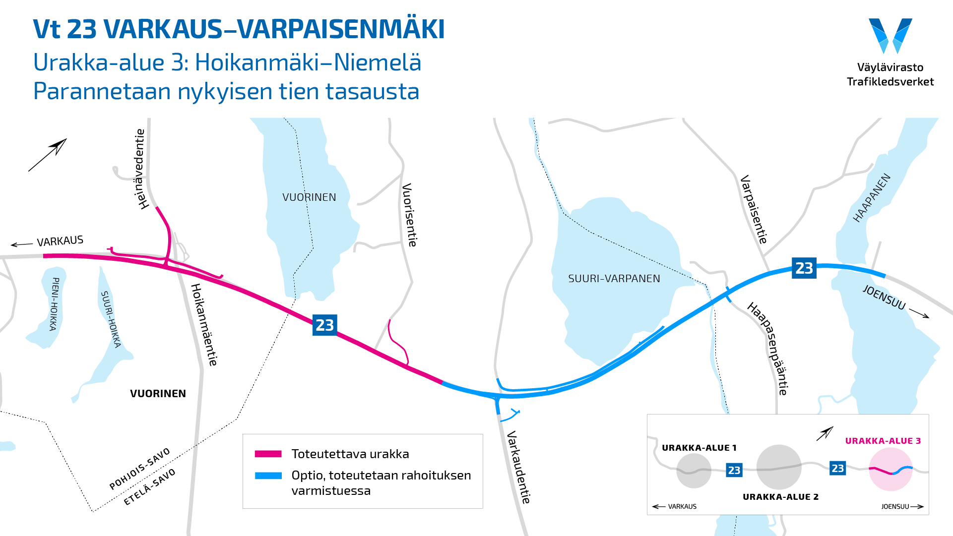 Vt 23 Varkaus–Varpaisenmäki -hanke on jaettu kolmeen urakka-alueeseen: