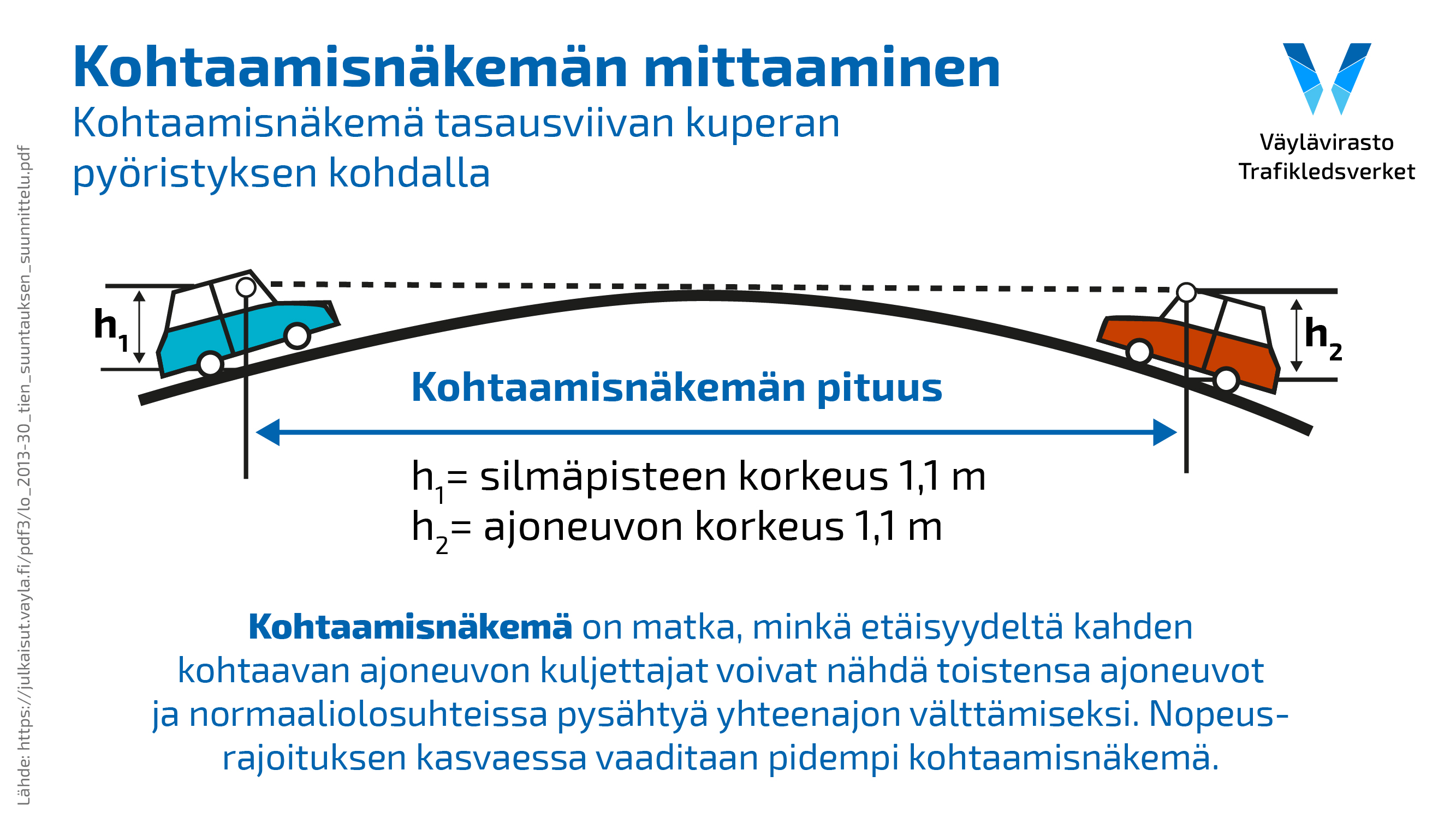 Kohtaamisnäkemä on matka, minkä etäisyydeltä kahden kohtaavan ajoneuvon kuljettajat voivat nähdä toistensa ajoneuvot ja normaaliolosuhteissa pysähtyä yhteenajon välttämiseksi. Nopeusrajoituksen kasvaessa vaaditaan pidempi kohtaamisnäkemä. Lähde: Väyläviraston ohje tien suuntauksen suunnittelusta.
