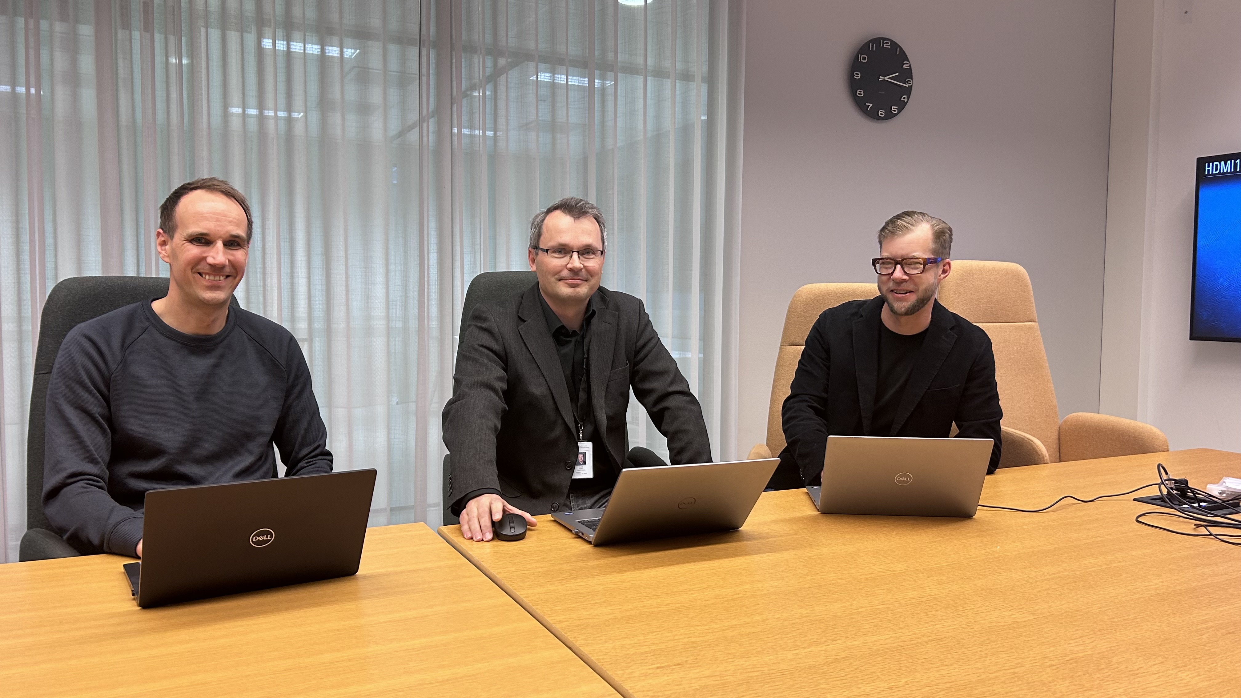Liitteen kuva: liiketoimintajohtaja Jaakko Mäkelä (GRK), projektipäällikkö Antti Koski (Väylävirasto) ja osastonjohtaja Janne Wikström (Väylävirasto) sopimuksen allekirjoitustilaisuudessa.
