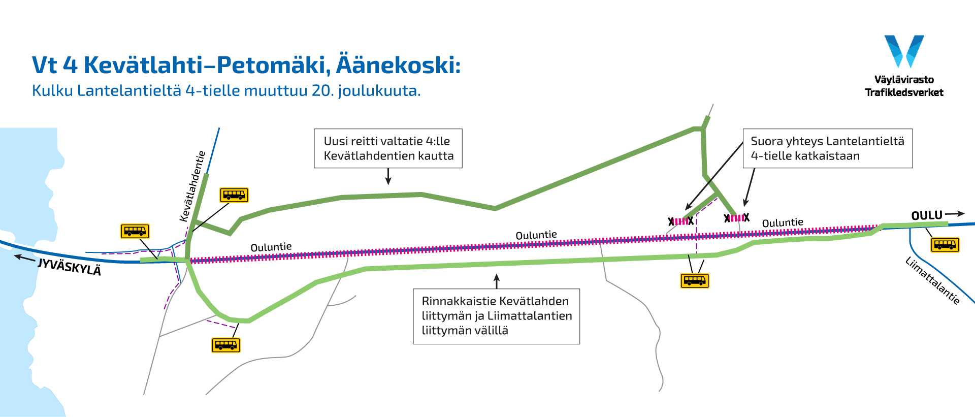"Suora liittymä valtatielle 4 poistuu kohdalle rakennettavan keskikaiteellisen ohituskaistan vuoksi ja siirtyy huomattavasti turvallisemmalle reitille rakenteilla olevaan Kevätlahden eritasoliittymään.", Väyläviraston projektipäällikkö Jarmo Niskanen toteaa.