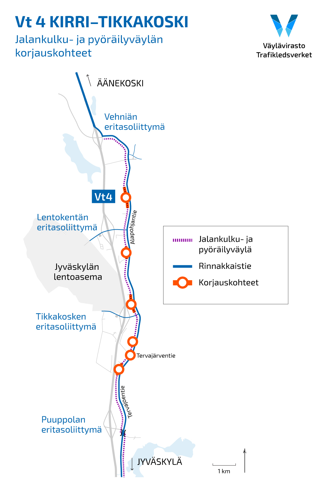 Vt 4 Kirri–Tikkakoski: Jalankulku- ja pyöräilyväylien routavaurioiden korjaukset käynnistyvät 2.5.2023
