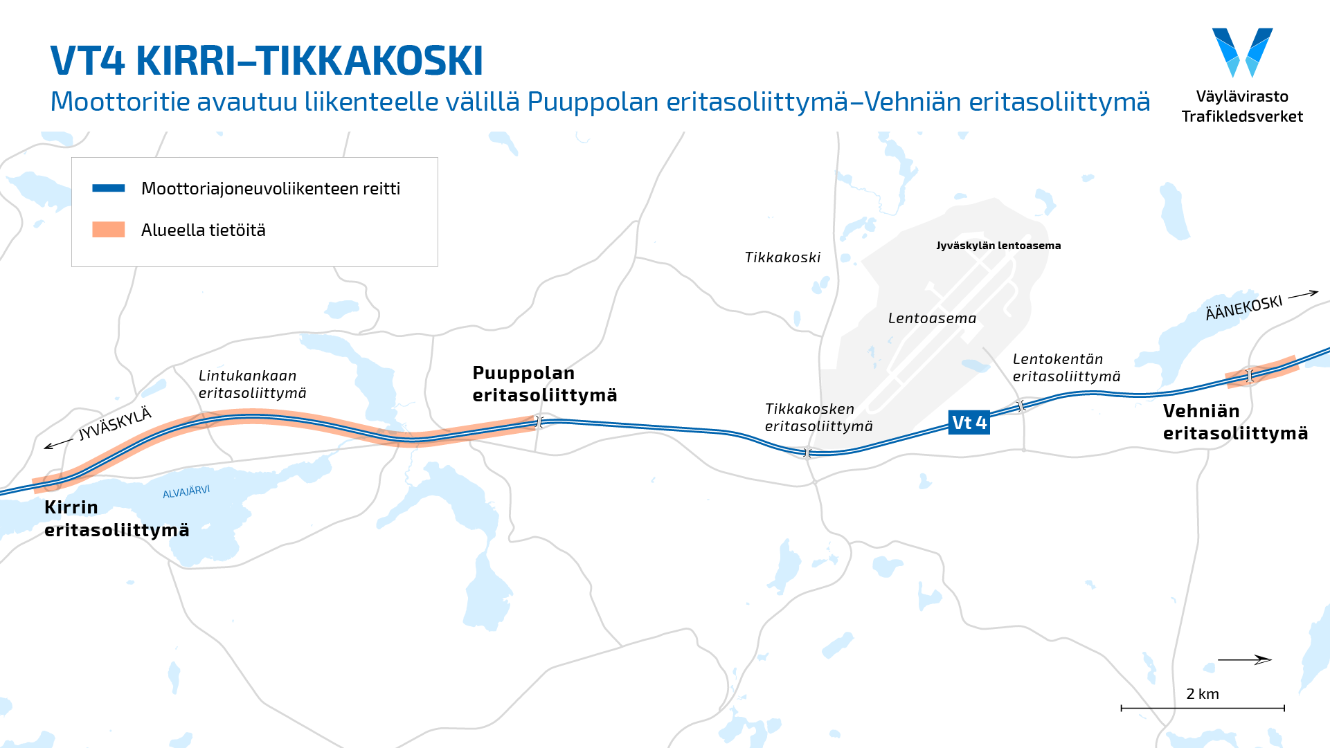 Vt 4 Kirri–Tikkakoski: Liikenne palaa moottoritielle Puuppolan ja Vehniän eritasoliittymien välillä 1. elokuuta