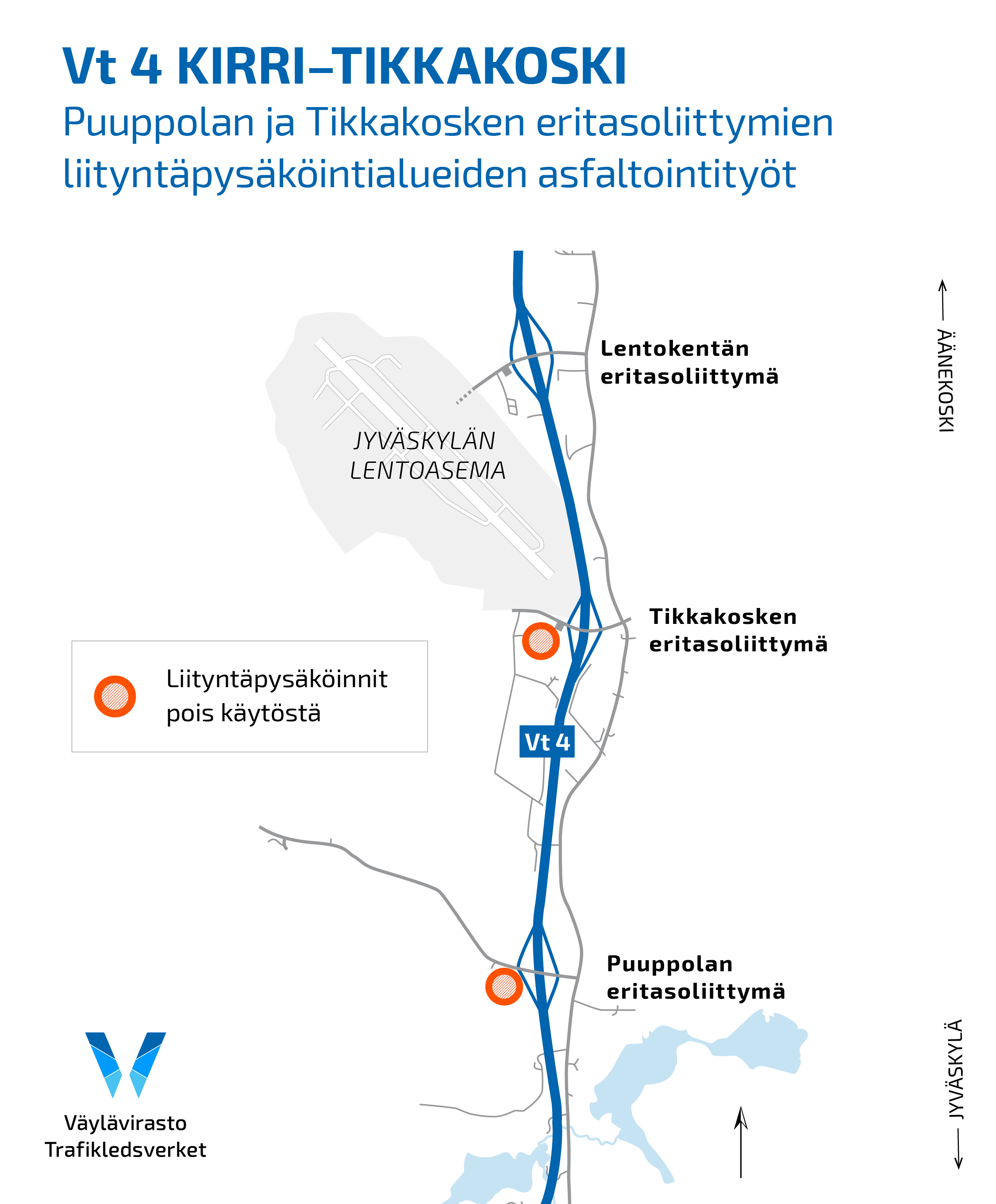 Vt 4 Kirri–Tikkakoski: Lintukankaan, Puuppolan ja Tikkakosken eritasoliittymien liityntäpysäköinnit pois käytöstä 7. syyskuuta alkaen asfaltointitöiden vuoksi