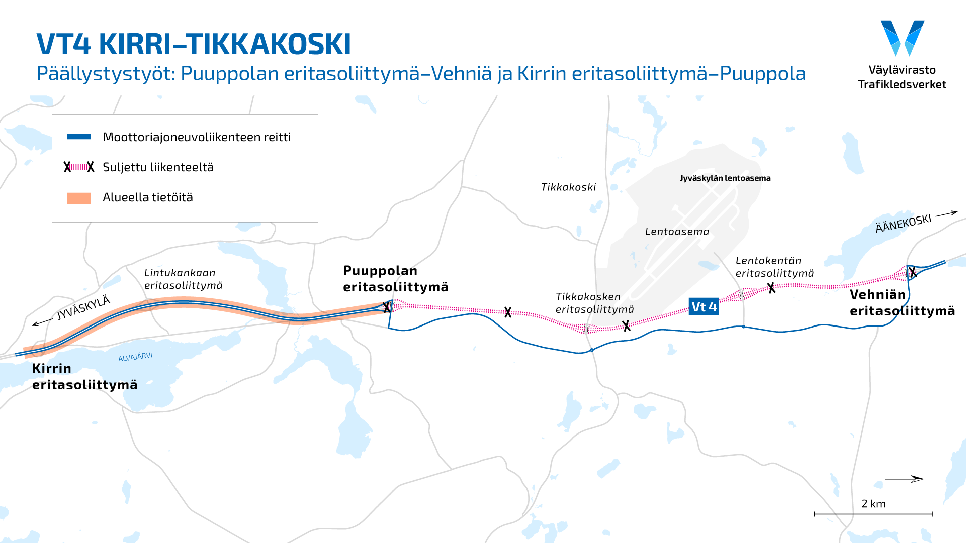 Vt 4 Kirri–Tikkakoski -hankkeen päällystystyöt moottoritiellä käynnistyvät 16.6. alkaen. Töitä tehdään välillä Puuppolan eritasoliittymä–Vehniä ja Kirrin eritasoliittymä–Puuppola.