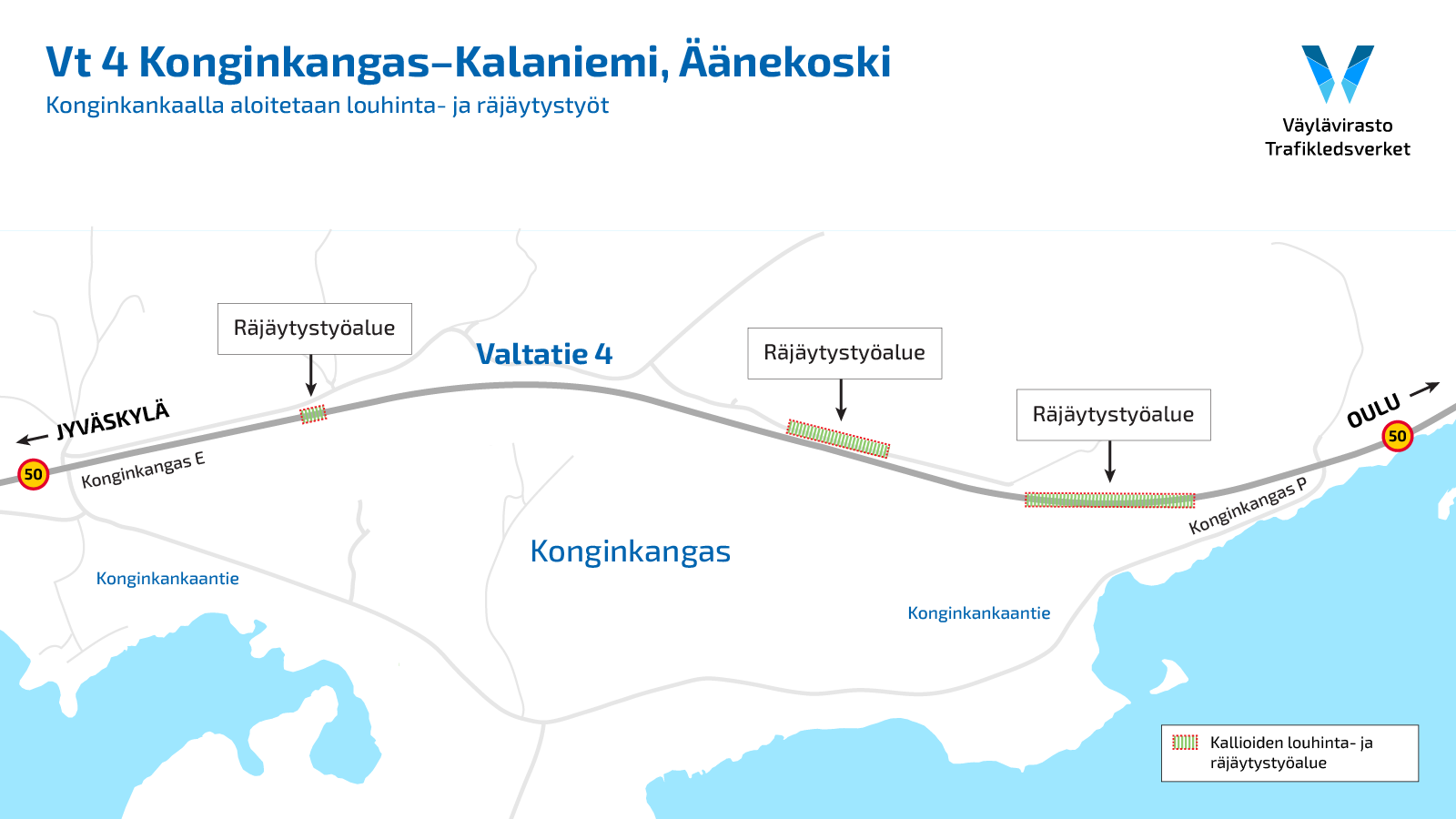 Valtatiellä 4 Konginkankaan eteläisen ja pohjoisen liittymien välissä aloitetaan tammikuussa louhinta- ja räjäytystyöt. Louhinta- ja räjäytystöiden takia liikennettä ei ohjata Konginkankaan taajaman kautta, eikä käytössä ole kiertoteitä. Liikenne pysäytetään enintään 8 minuutin ajaksi.