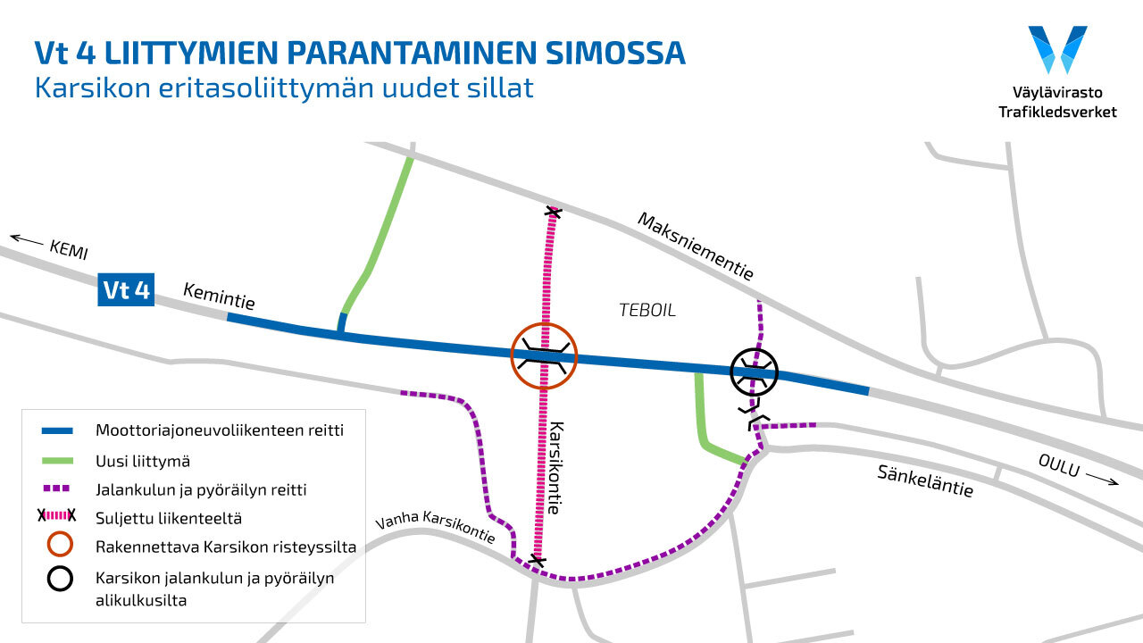 Karsikon eritasoliittymä on yksi valtion 4. lisätalousarvion kohteista vuodelle 2020. Vt 4 liittymien parantamiseen Simossa kuuluu lisäksi Simon taajaman kohdan sekä Ranuantien eritasoliittymän rakentaminen. Näissä kohteissa on menossa vielä suunnitteluvaihe ja niiden rakentaminen on tarkoitus aloittaa vuoden 2021 aikana.