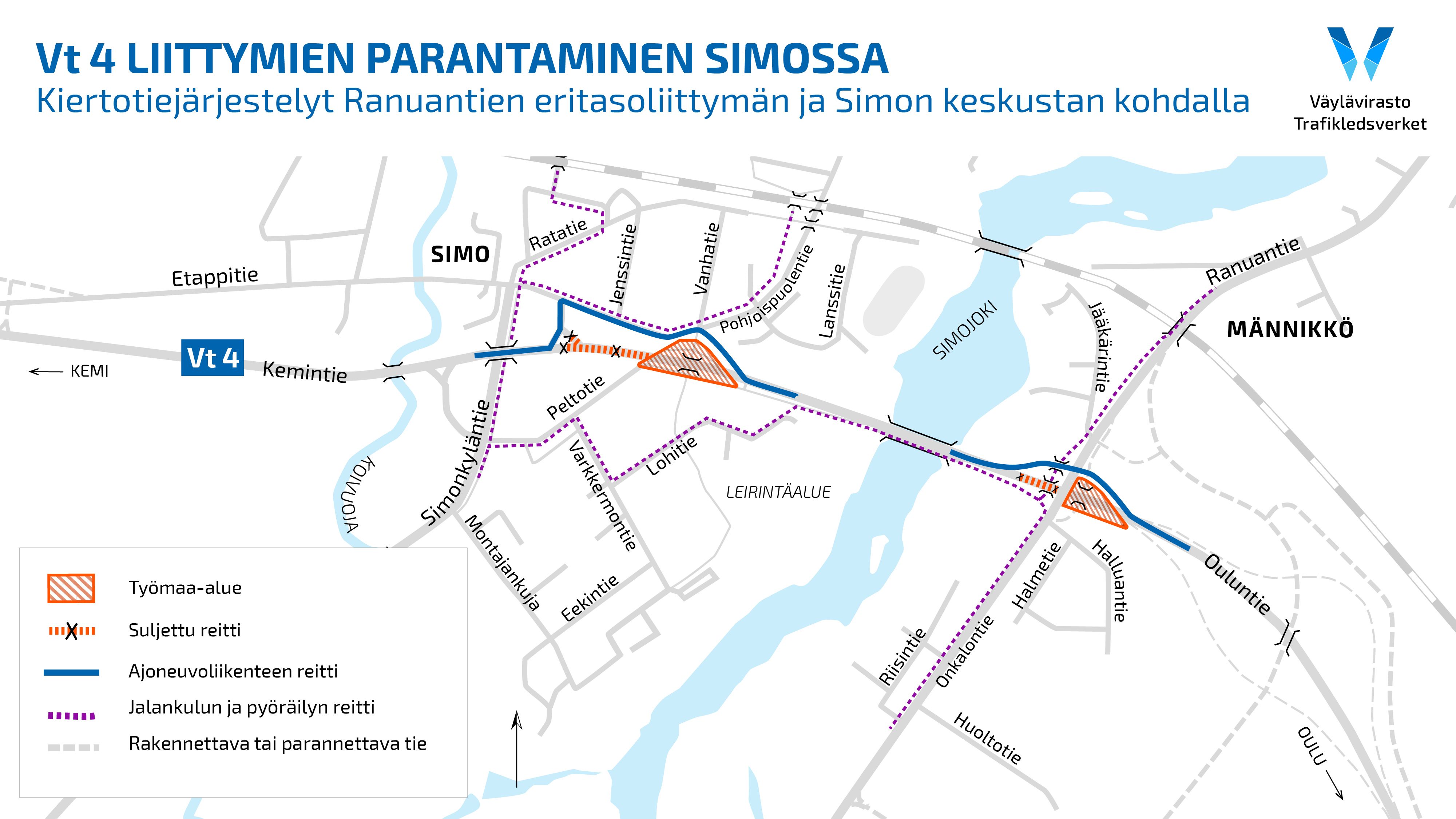 Vt 4 Etappitie-Simojoen silta -urakassa rakennetaan uusi jalankulun ja pyöräilyn alikulkusilta, jonka rakentamisen ajaksi ajoneuvoliikenne ohjataan kulkemaan siltapaikan ohi Pohjoispuolentien ja nykyisen liittymän kautta. Nelostien alittavat jalankulkijat ja pyöräilijät ohjataan kulkemaan Simonkyläntien nykyisen risteyssillan jalankulun ja pyöräilyn väylän kautta.