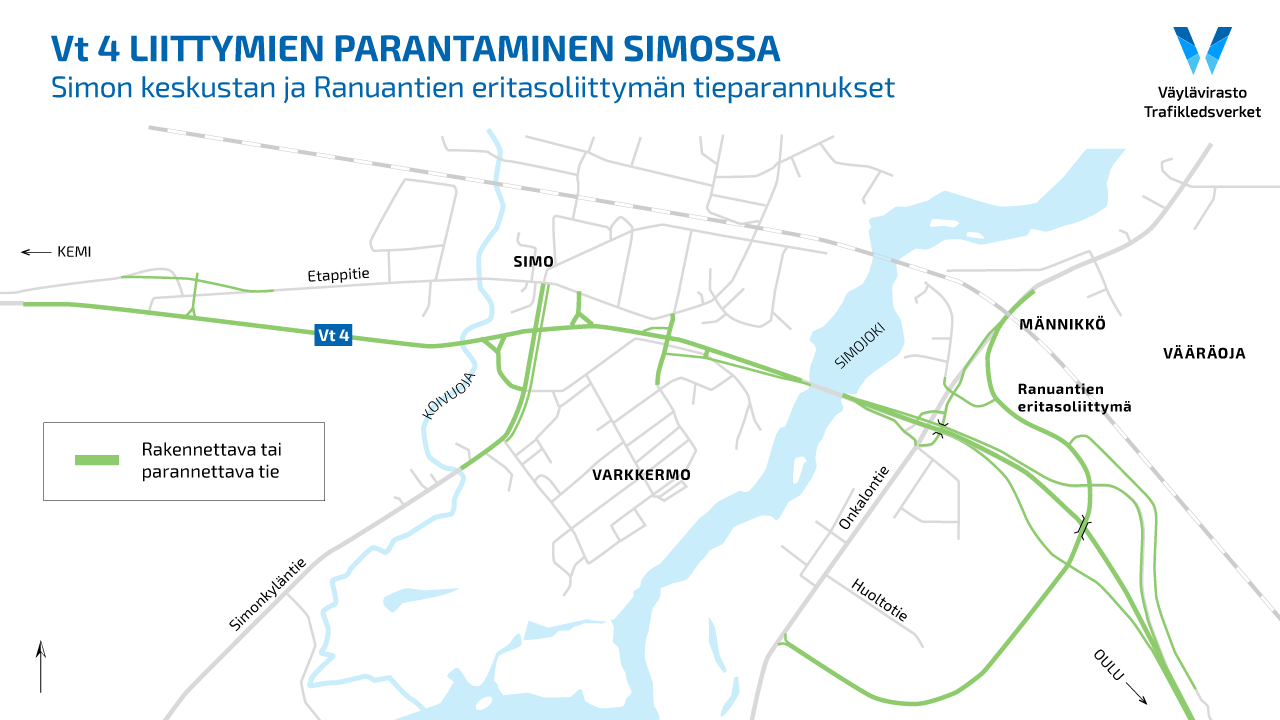 Ranuantien eritasoliittymä on yksi valtion 4. lisätalousarvion kohteista vuodelle 2020. Vt 4 liittymien parantamiseen Simossa kuuluu lisäksi syksyllä 2021 valmistunut Karsikon liittymän rakentaminen sekä valmisteluvaiheessa oleva Simon taajaman kohdan rakentaminen.