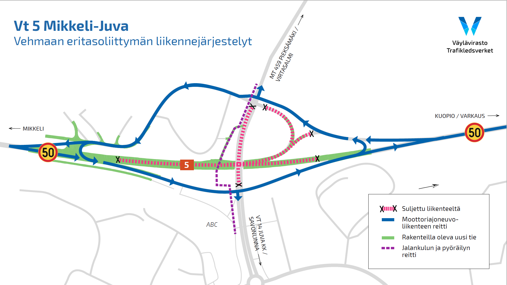 Vehmaan eritasoliittymässä toukokuun puolivälissä alkavat työt vaikuttavat liikenteeseen Mikkeli / Kuopio ja Pieksämäki / Savonlinna -suunnissa. Vehmaan ABC-aseman kohdalla sijaitseva viitostien ylittävä silta suljetaan liikenteeltä. Työt Vehmaan eritasoliittymässä kestävät arviolta elokuun alkuun.