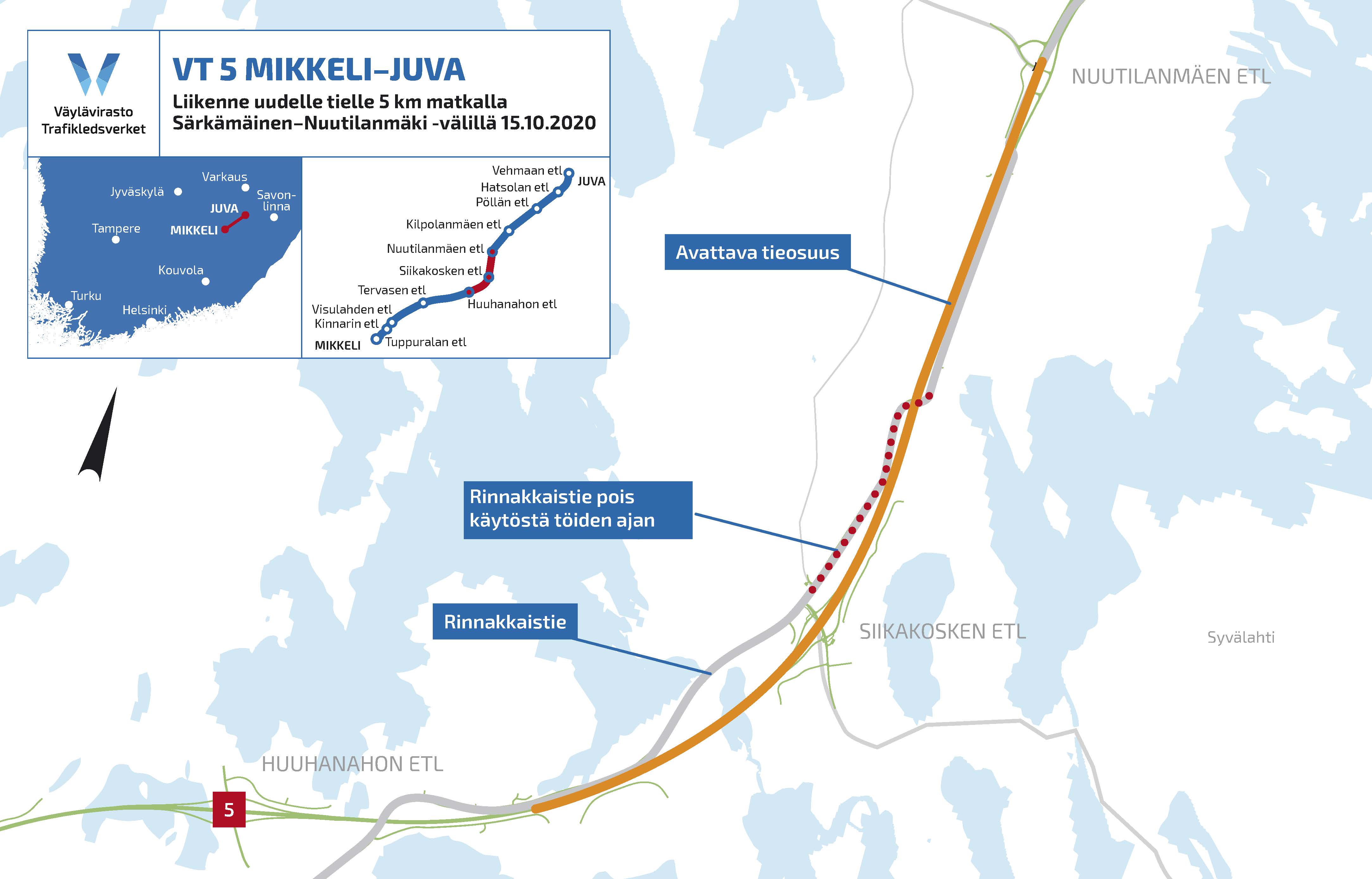 Valtatie 5 Mikkelin ja Juvan välillä rakennetaan nelikaistaisena, keskikaiteellisena tienä, jonka liittymät toteutetaan eritasoisina. Mikkeli–Nuutilanmäki -osuudella tie rakennetaan pääosin uuteen maastokäytävään ja nykyinen valtatie jää rinnakkaistieksi. Nuutilanmäki–Juva osuus rakennetaan nykyisen valtatie 5:n kohdalle 2 + 2 kaistaisena, eli koko tieosuus Vt 5 Mikkeli–Juva on laatutasoltaan sama. Vt 5 Mikkeli–Juva otetaan liikenteelle vaiheittain vuosina 2020–2021 ja lopullisesti tie on valmis kesällä 2022.