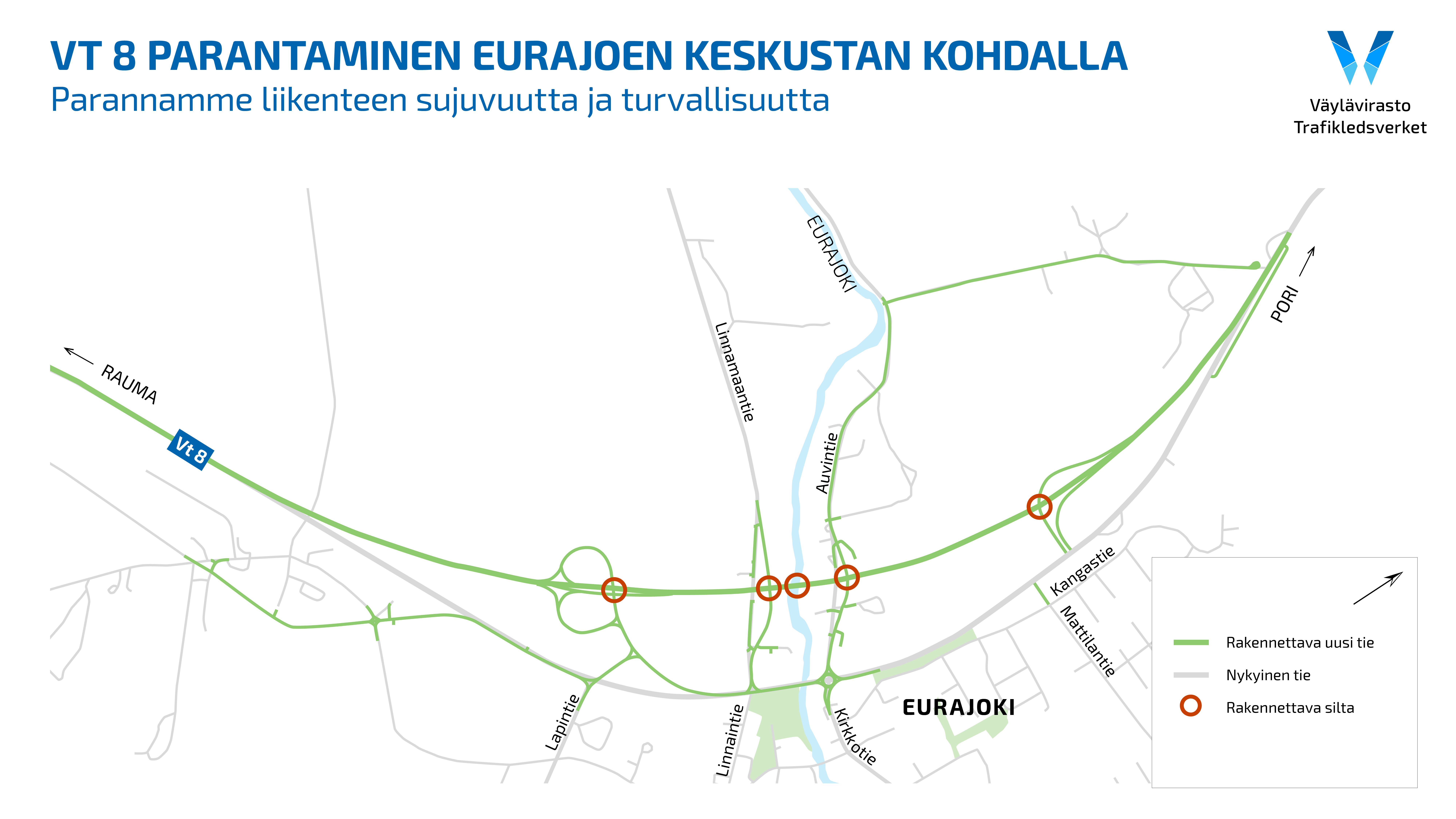 Väyläviraston ja Eurajoen kunnan yhteisrahoitteisen urakan tavoitteena on parantaa liikenteen sujuvuutta ja turvallisuutta Eurajoen keskustan kohdalla ja tukea kunnan kehittymisedellytyksiä.
