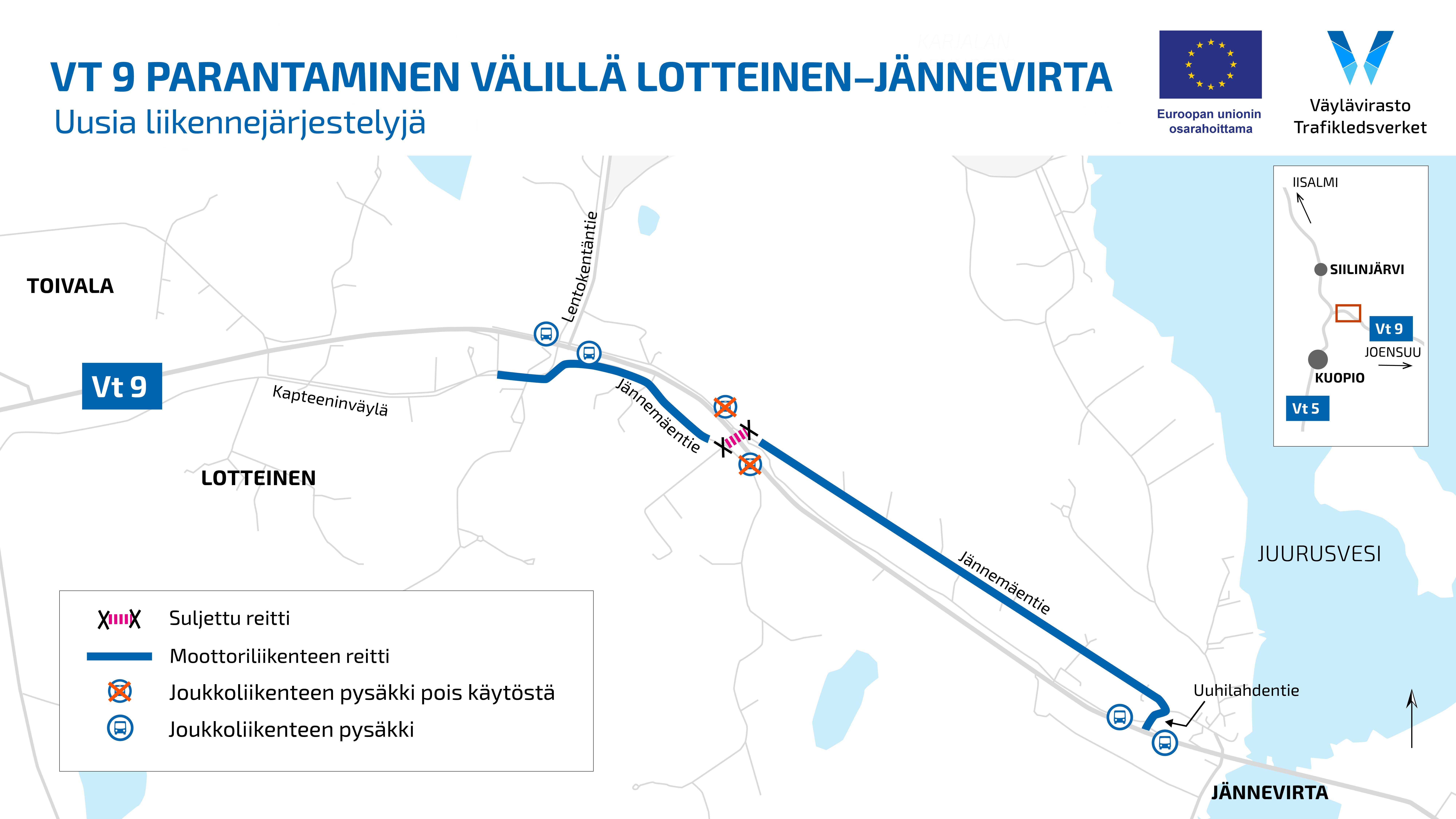 Jännemäentien läpikulku valtatie 9:n alta Marttilan alikulkukäytävää pitkin päättyy maanantaina 18.3.2024. Samalla viereiset linja-autopysäkit poistuvat käytöstä. Muutoksella pystytään erottamaan hankkeen työmaa ja liikenne toisistaan.