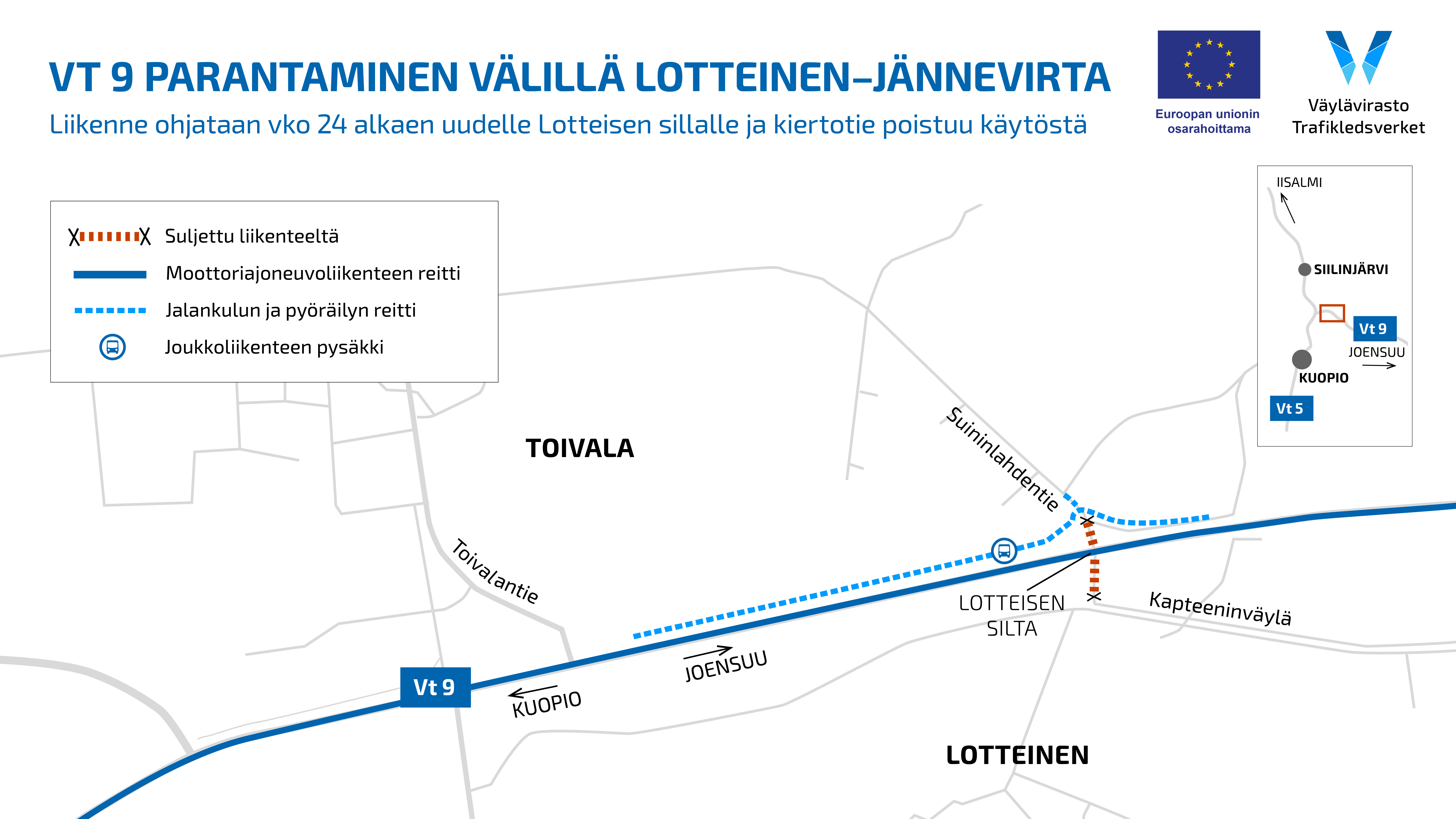 ”Alamme ottaa lopullisia rakenteita vaiheittain liikenteen käyttöön. Lotteisen risteyssillan valmistumisen myötä poistamme käytöstä kiertotien, joka on ollut käytössä jo viime kesästä asti. Kun sillan alittava Suininlahdentie valmistuu ennen koulujen alkua, jalankululle ja pyöräilylle avautuu lopullinen, turvallinen yhteys valtatien alitse”, sanoo projektipäällikkö Harri Liikanen Väylävirastosta.