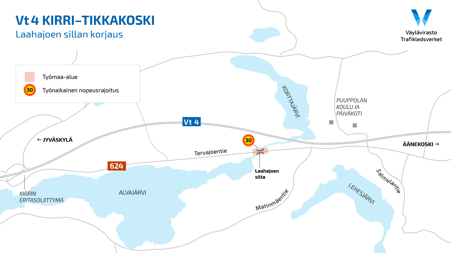 Mt 624 varrella sijaitsevan Laahajoen sillan korjaustyöt käynnistyvät maanantaina 2. toukokuuta. Siltatyömaan kohdalla on käytössä vain yksi ajokaista. Työalueella on voimassa alennettu nopeusrajoitus 30 km/h. Työt valmistuvat elokuun loppuun mennessä. Töiden ajan on erikoiskuljetukset tehtävä moottorien kautta.