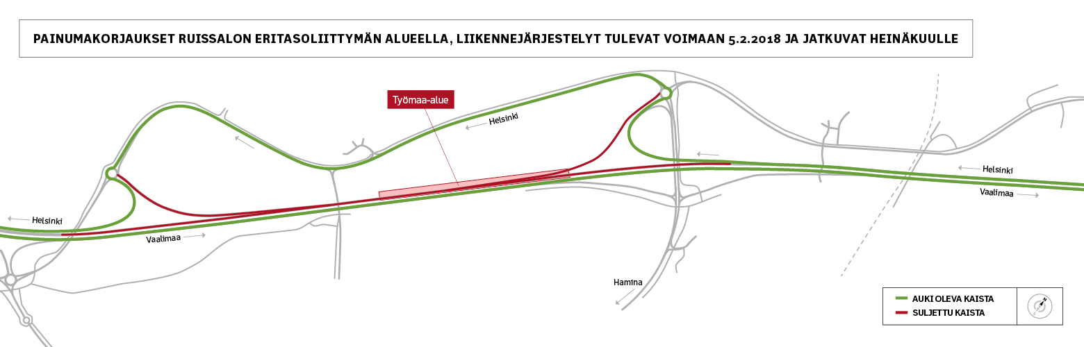 Töiden ajaksi valtatie 7:n pohjoinen ajorata Lankamalmin ja Ruissalon eritasoliittymien välillä suljetaan. Vaalimaan suunnasta Helsinkiin kulkeva liikenne ohjataan Ruissalon eritasoliittymästä Kiilintielle (Mt 26) oheisen kartan mukaisesti. Helsingin ja Kotkan suunnasta saapuva ohikulkuliikenne kulkee vt 7 eteläistä ajorataa pitkin. Liikennejärjestelyt tulevat voimaan 5.2. ja kestävät heinäkuulle saakka.
