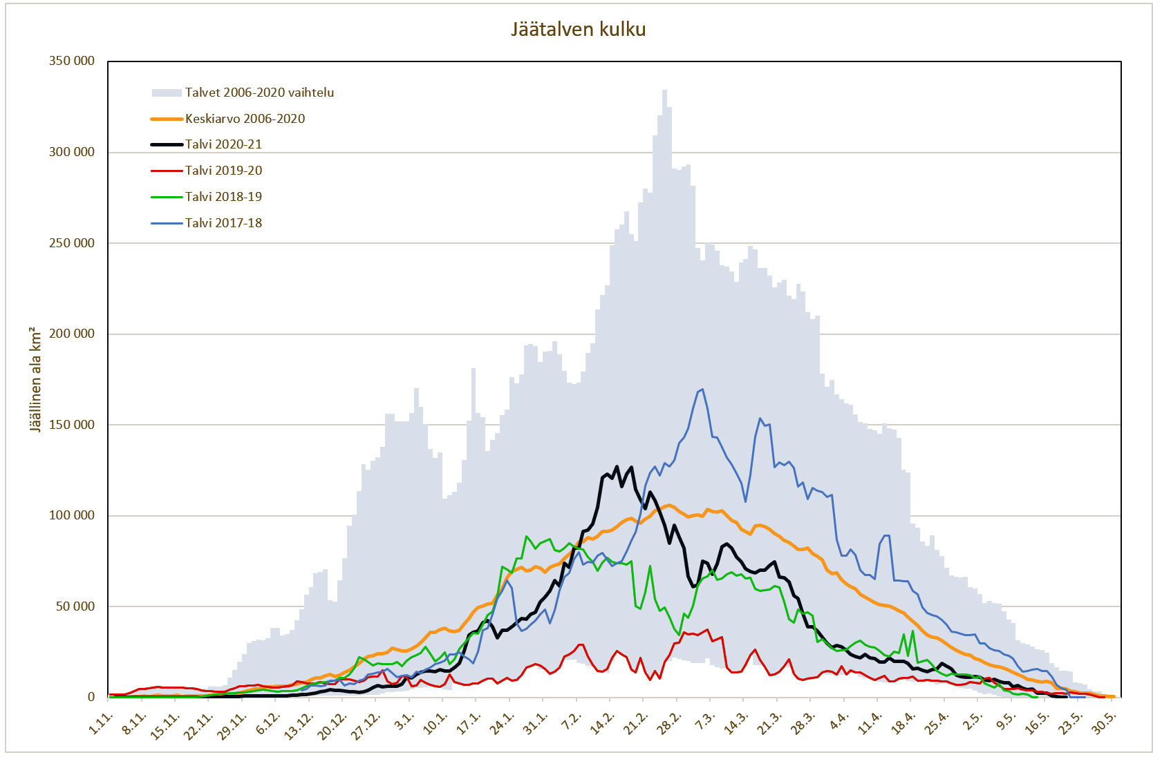 However, the 2020-2021 season was an average winter in terms of the amount of ice coverage. The ice cover was at its most extensive on 15 February 2021 when it reached 127,000 km².