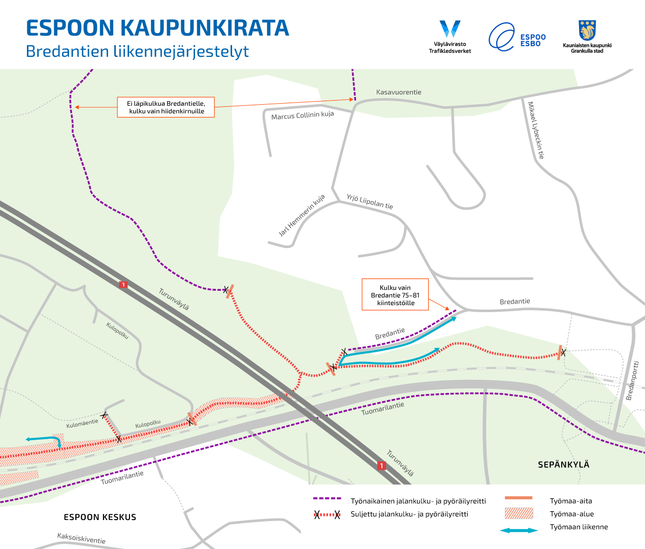 - Väliaikaiset muutokset Bredantien ja alueen liikennejärjestelyissä ovat mahdollisia. Seuraathan alueen opasteita.