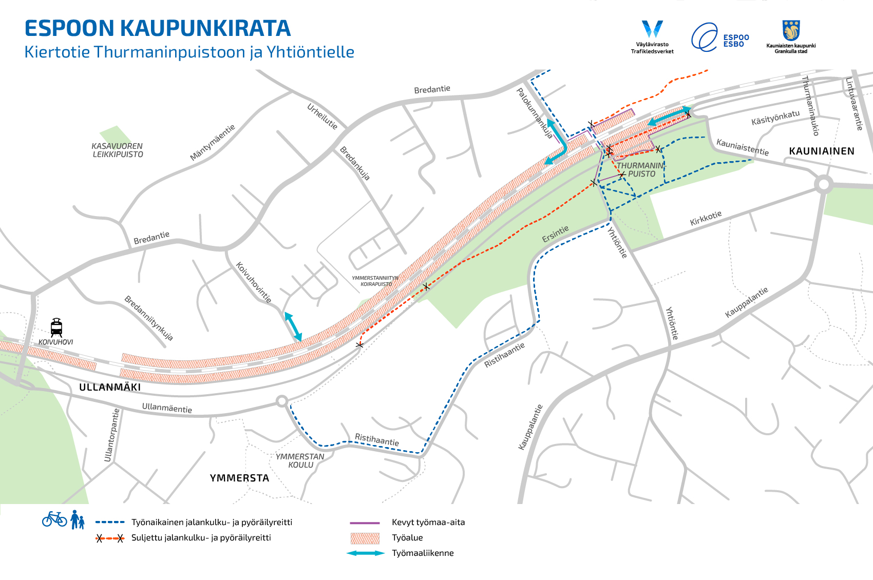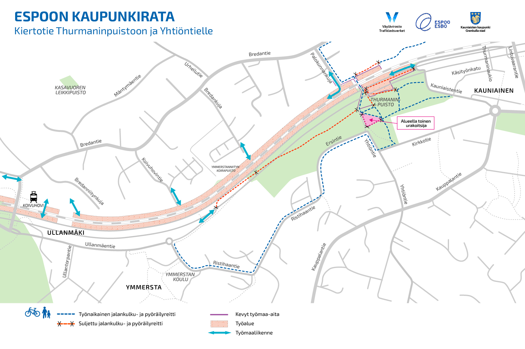 - Thurmaninpuistossa on aloittanut Espoon kaupunkirata -hankkeen ulkopuolinen urakoitsija, ja tällä on vaikutusta puiston reitteihin. Kyseisen urakoitsijan urakka jatkuu joulukuuhun 2025 saakka. Puiston reitteihin tulee todennäköisesti muutoksia, mutta kulku puiston läpi säilyy.