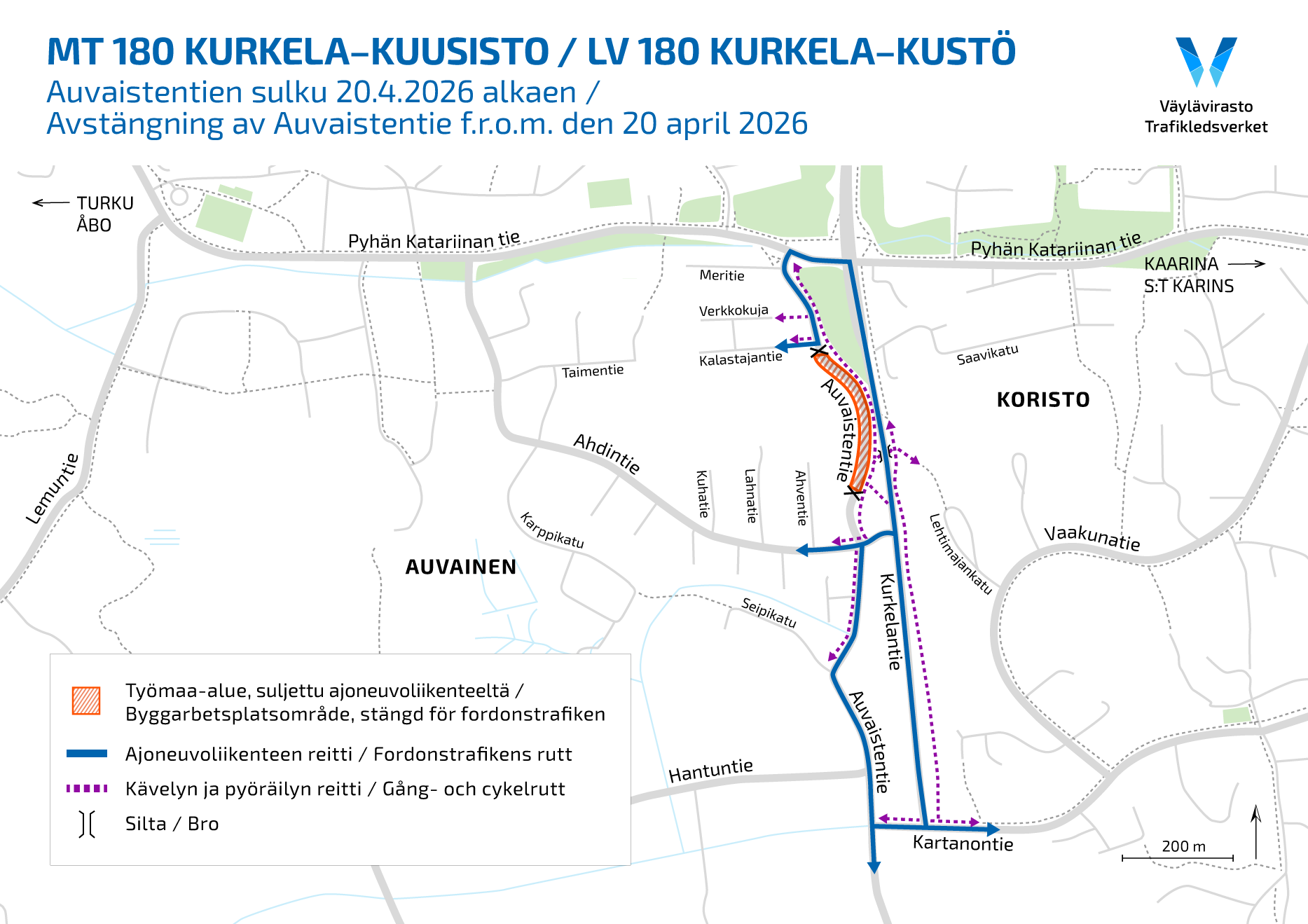 Auvaistentie suljetaan ajoneuvoliikenteeltä 20.4.2026 alkaen noin neljäksi viikoksi. Kiertoreitti on esitetty kartassa.