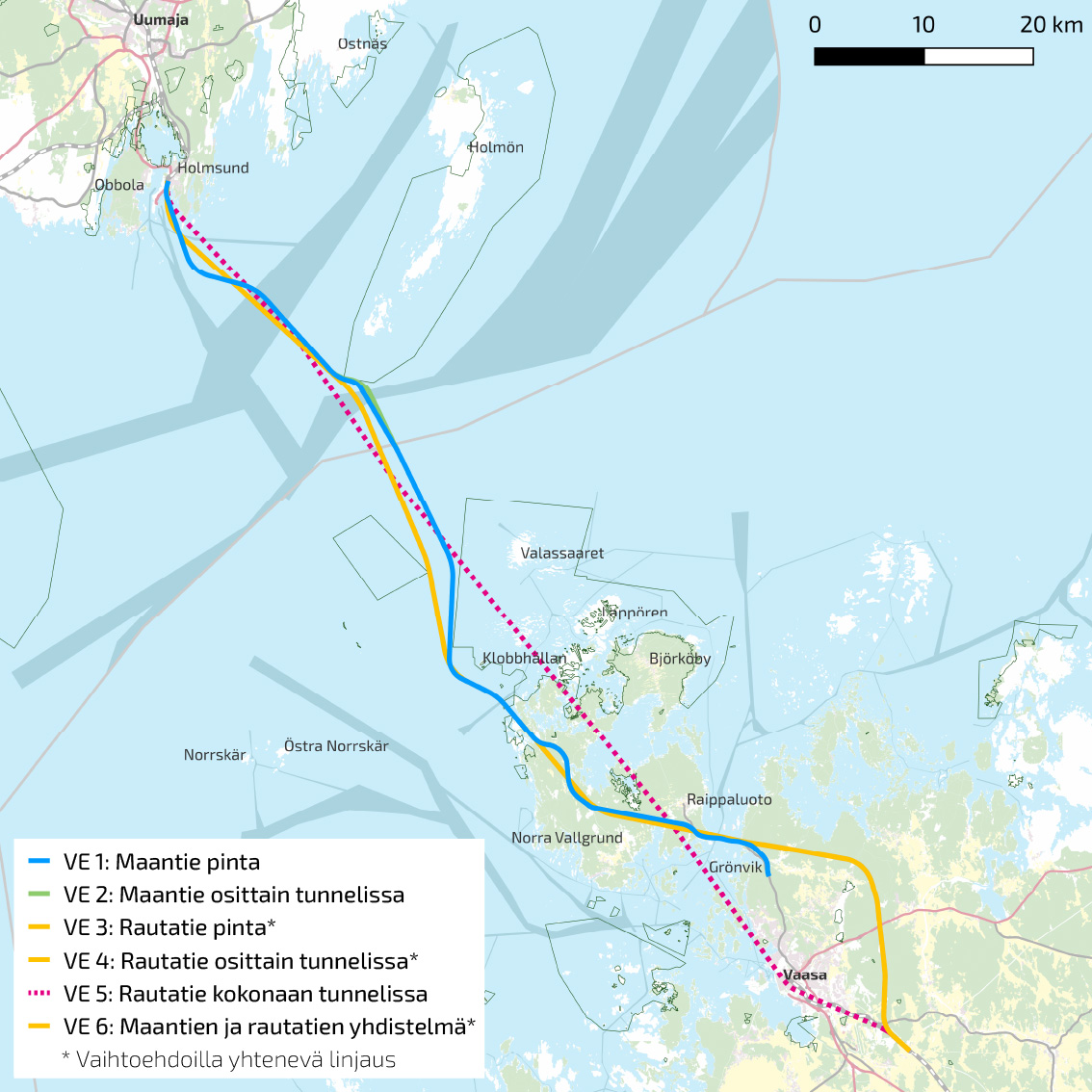 Toteuttamiskelpoisia ratkaisuja on useita. Yhteys voi olla tie, rautatie tai näiden yhdistelmä. Esiselvityksessä esiteltiin kuusi mahdollista toteutusvaihtoehtoa: