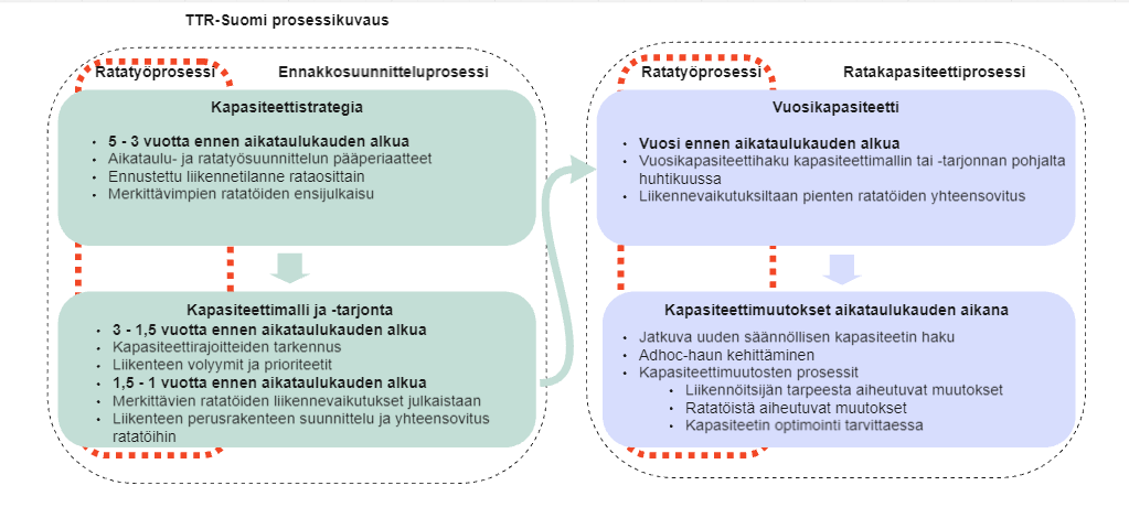 Kapasiteettistrategia on TTR:n ennakkosuunnittelun ensimmäinen vaihe. Sen tekeminen aloitetaan viisi vuotta ennen kyseessä olevan aikataulukauden alkua, päättyen sen julkaisuun kolme vuotta ennen aikataulukauden alkua, ajankohdassa X-36 kk. Tämä kapasiteettistrategia on luotu koskien aikatauluvuotta 2029. Tämä dokumentti sisältää kuvauksen strategian maantieteellisestä kattavuusalueesta, ennakoidut pysyvät muutokset infraan, ennakoidut suurimmat kapasiteettirajoitteet, ratatöiden suunnitteluperiaatteet sekä kuvauksen liikennevirroista. Kapasiteettistrategia-dokumentti noudattaa formaatiltaan RNE:n (RailNetEurope) mallipohjaa ja sen sisältöä ohjaa Väyläviraston strateginen suunnittelu.