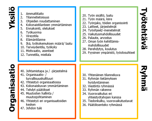 Väylävirasto hyödyntää HOF-tekijöiden tunnistamisessa Työterveyslaitoksen kehittämää nelikenttämallia. Nelikenttä toimii hyvänä tarkastelukehikkona ylipäätään minkä tahansa ilmiön, tapahtuman tai muutoksen tarkasteluun antaen laaja-alaisen ymmärryksen kohteesta. Sen avulla on helppo miettiä esimerkiksi oman työyhteisön näkökulmasta mitkä tekijöistä ovat nyt hyvin tai mitkä vastaavasti eivät oikein tunnu toimivan ja mitä pitäisi parantaa.