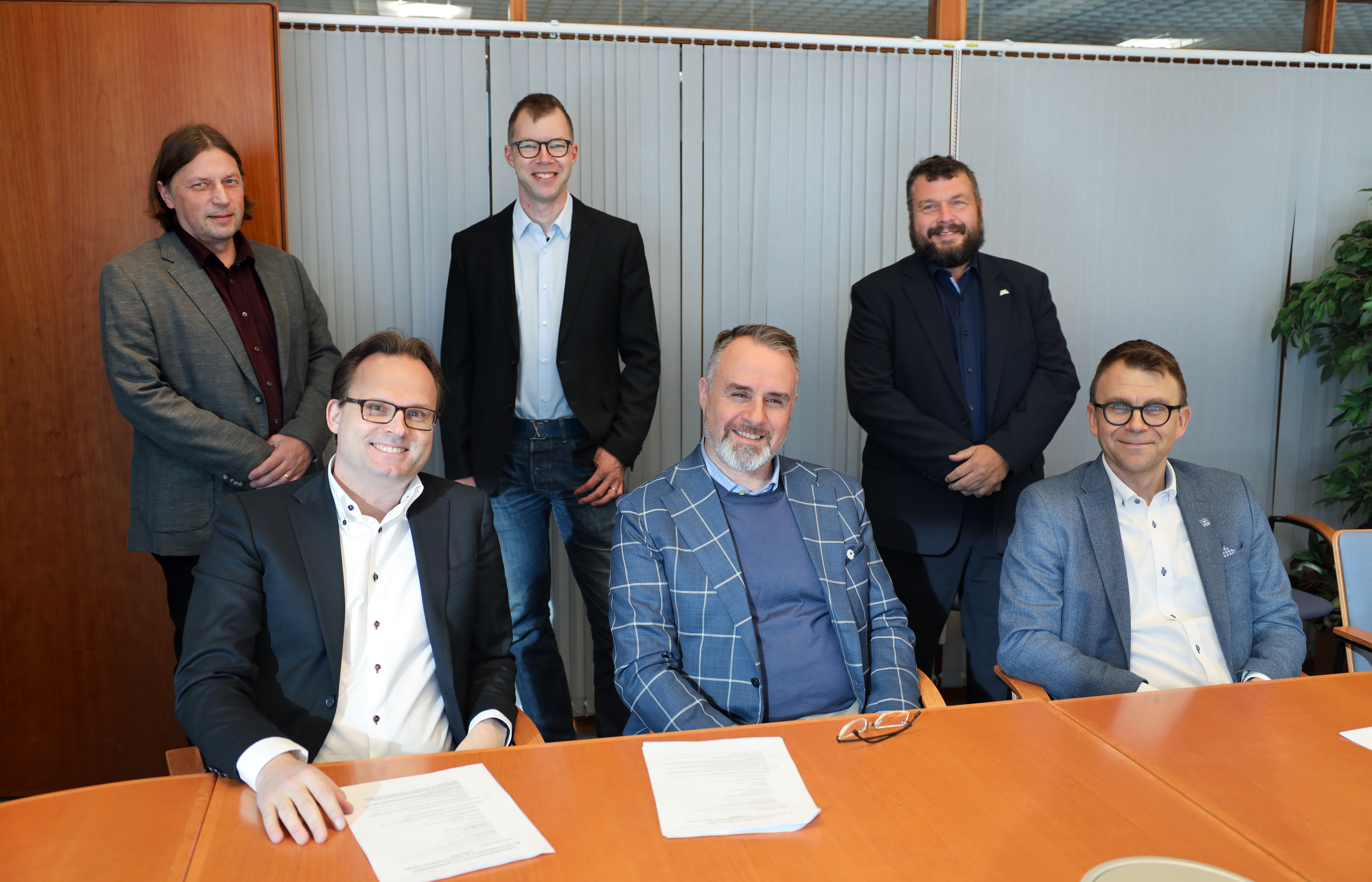 Bild: Från vänster i bakre raden Timo Hirvasmaa från Kreate, Janne Wikström och Lars Westermark från Trafikledsverket och vid bordet Jaakko Kivi och Sami Rantala från Kreate samt Esa Sirkiä från Trafikledsverket undertecknar avtalet om utvecklingsfasen för projektet med att förnya Rävsunds- och Hessundsbron på landsväg 180.