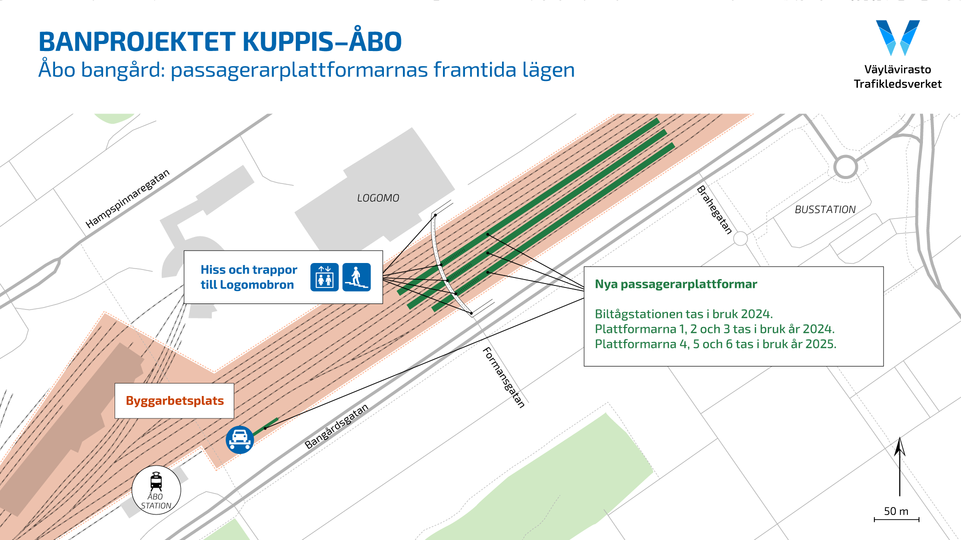 "Att avlägsna plattformsstigen förbättrar avsevärt säkerheten på personbangården när man inte längre går över spåren från en plattform till en annan utan via Logomobron. Runt personbangården byggs också ett stängsel för att förhindra genande över spåren", berättar Erkki Mäkelä, projektchef vid Trafikledsverket.