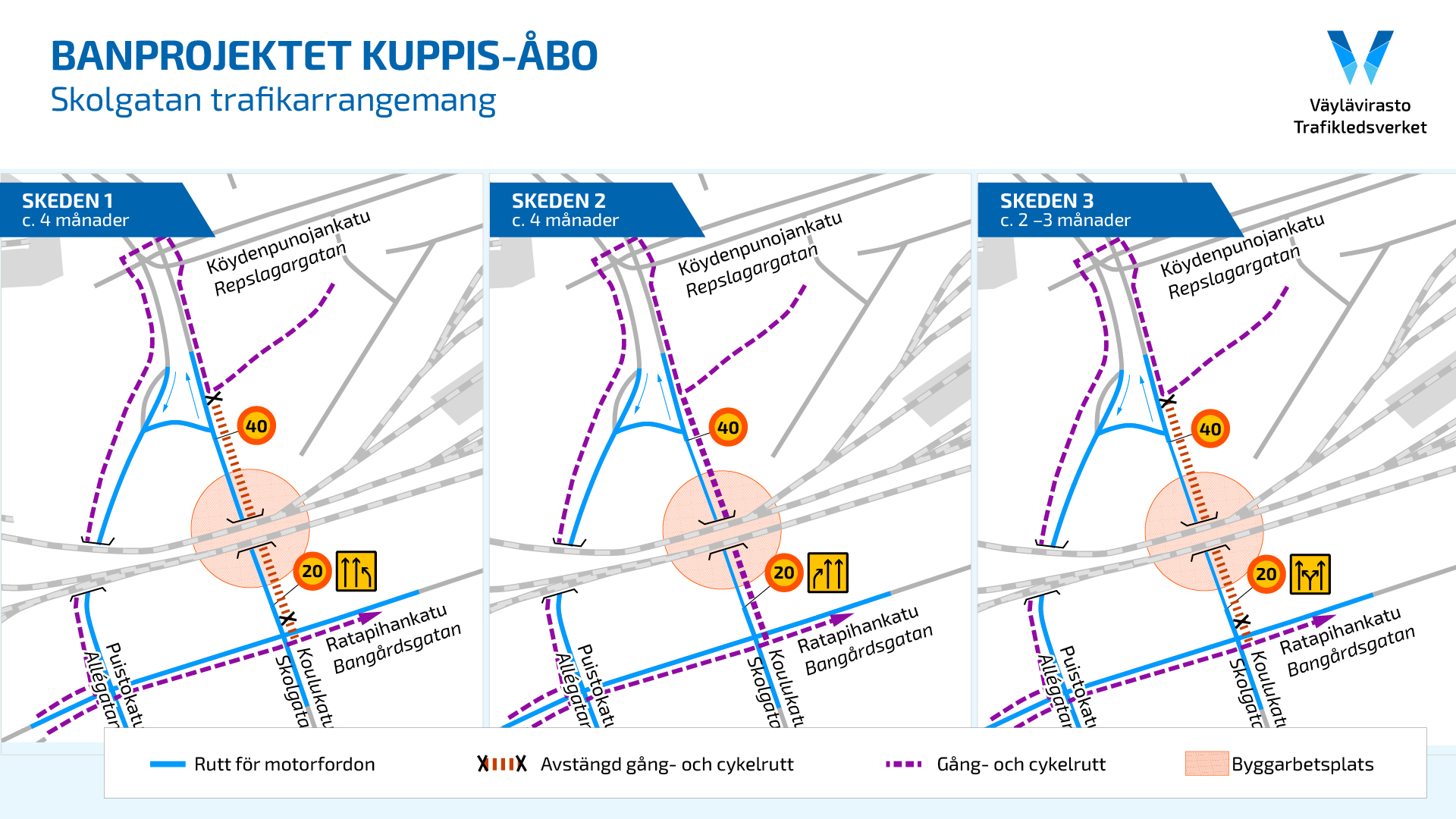 Under arbetets gång införs också sådana trafikarrangemang som inte helt överensstämmer med kartbilden för faserna 1-3. Det informeras separat om dessa. Rivningsarbetena inleds före utgången av juli 2023.