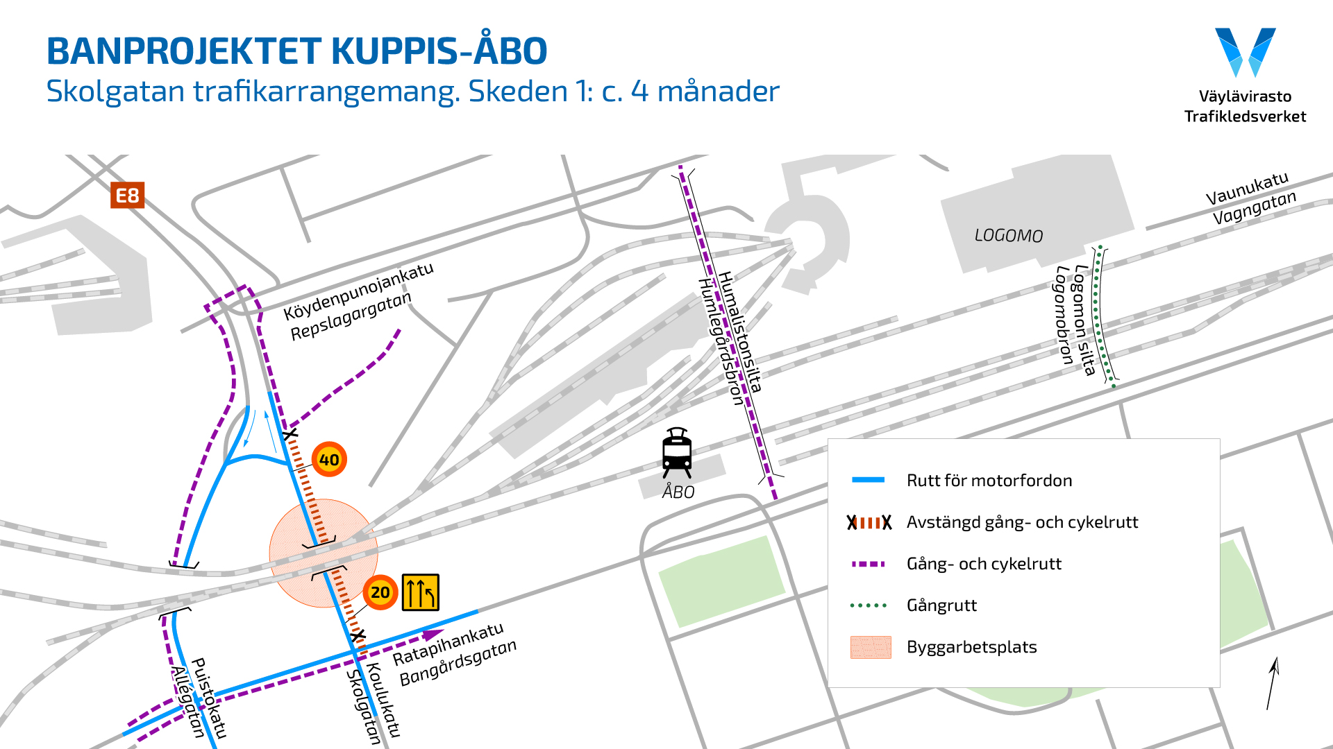 Skolgatans underfartsbro som nått slutet av sin livscykel rivs i etapper med början i juli 2023. Rivningen av bron medför trafikarrangemang för fordonstrafiken, fotgängare och cyklister fram till 2025. Byggarbetena är nödvändiga för att säkerställa en säker trafikering i området i och med den nya bron. Som belöning får man ett slutresultat som består av en tillgänglig, säker och smidig stad och bantrafik.