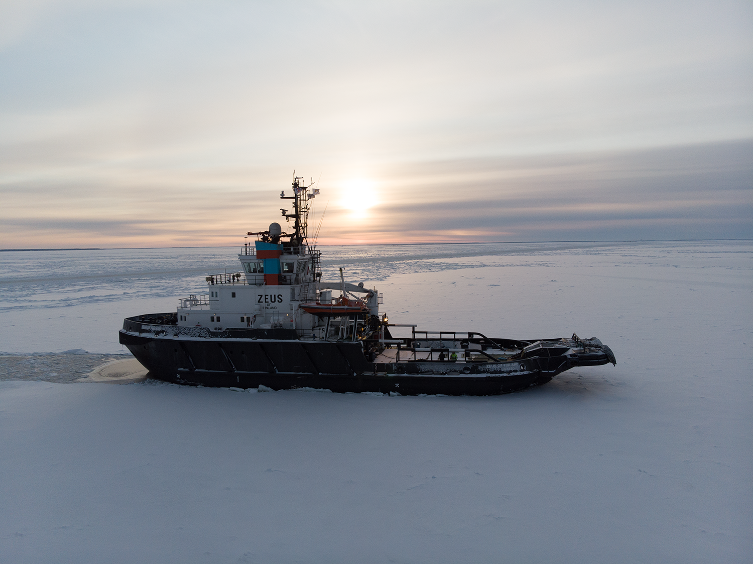 Innan Alfons Håkans Zeus of Finland anländer till Bottenviken assisteras trafiken vid behov med Trafikledsverkets avtalsbogserare.
