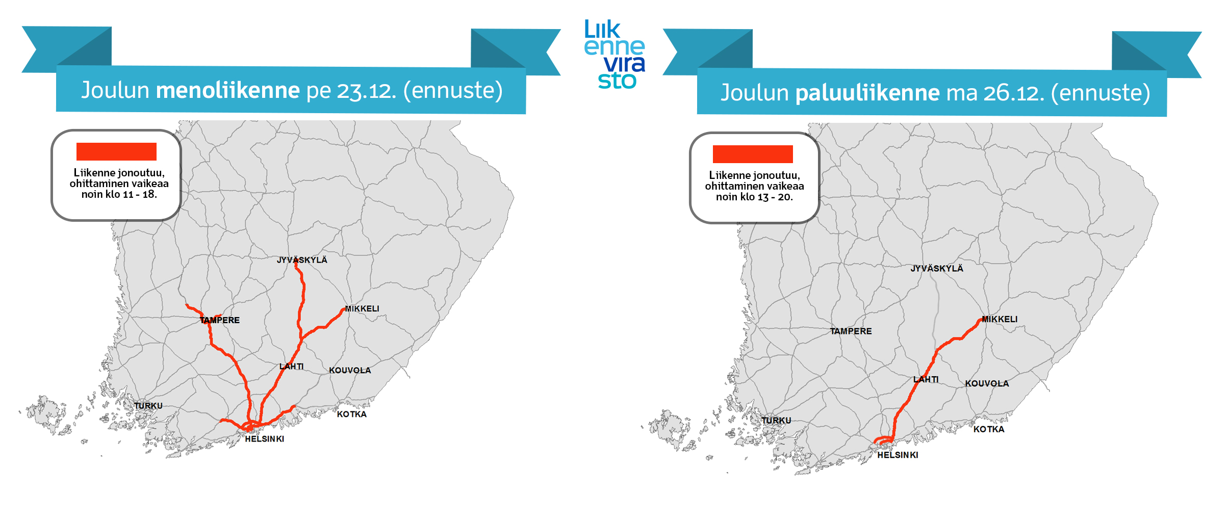 Liikennevirasto arvioi, että joulun meno- ja paluuliikenteessä on tänä vuonna ruuhkaisempaa kuin viime vuonna, koska liikenne jakaantuu vain muutamalle päivälle. Torstaina 22.12. ja perjantaina 23.12. liikenne voi jonoutua varsinkin Helsingin ulosmenoteillä Hämeenlinnan, Lahden ja Porvoon suuntaan. Eniten menoliikennettä on aatonaattona 23.12. kello 11 ja 18 välillä, jossa huipputunnit ovat kello 13–16.