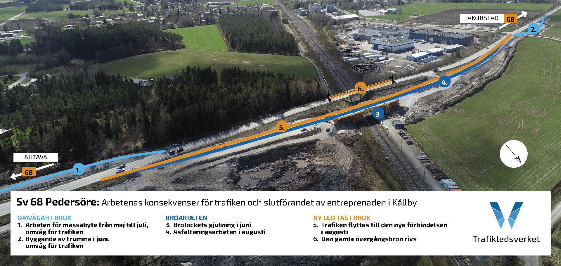 Förbättringsarbetet på stamväg 68 i Pedersöre framskrider enligt tidtabellen. Under sommaren iståndsätts underfartstunneln för gång- och cykeltrafik i Edsevö och i Kållby utförs massabytes- och trumarbeten. Broarbeten slutförs på båda objekten i slutet av sommaren.