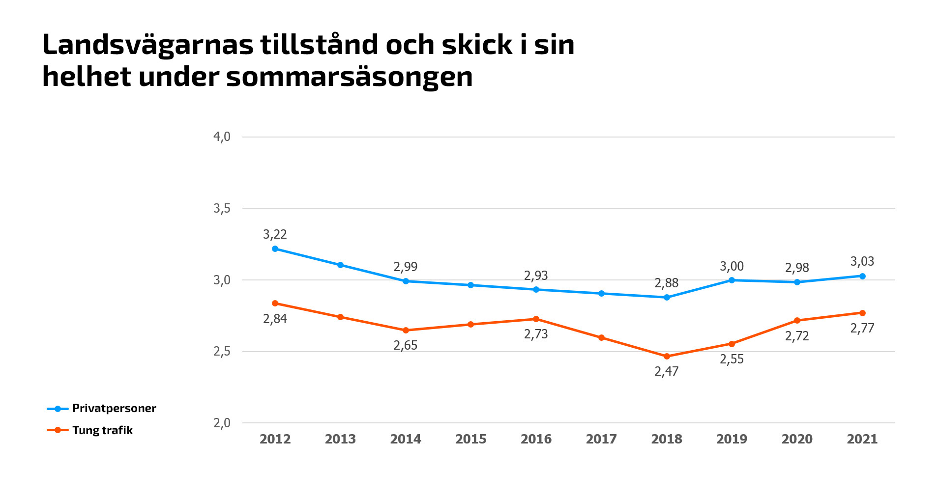 Bild: Landsvägarnas tillstånd och skick under sommarsäsongen. Resultat från undersökningar av trafikanternas nöjdhet åren 2011-2021.