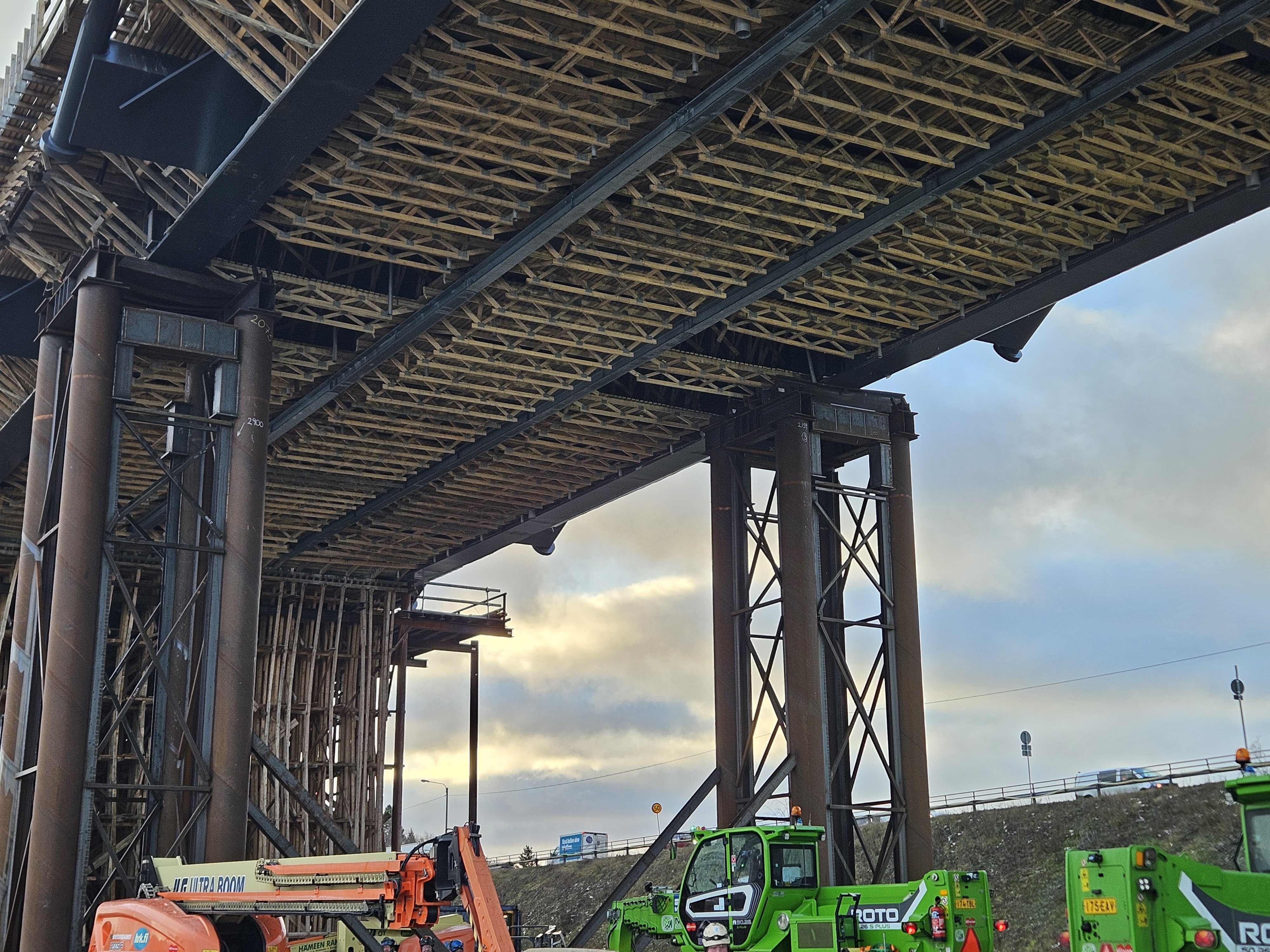 ”Under de senaste två veckorna har vi gjort upp planer och utfört förberedande arbeten för att återställa brodelen. I hjälpstödens övre ändar planerades plattformar för skjutningen med hydrauliska domkrafter med vilka brodelen lyfts på plats. Arbetet med plattformarna och tillhörande balkar är på slutrakan. Arbetet fortsätter i januari och kommer att vara klart i slutet av månaden. Denna typ av förargliga händelser är i allmänhet summan av många faktorer, precis som i detta fall. En av de viktigaste faktorerna var det tillfälliga lagret i övre ändan av hjälpstödet, som inte jämnt fördelade lasten på alla fyra tvärbalkarna", konstaterar projektchef Timo Hirvasmaa från Kreate.