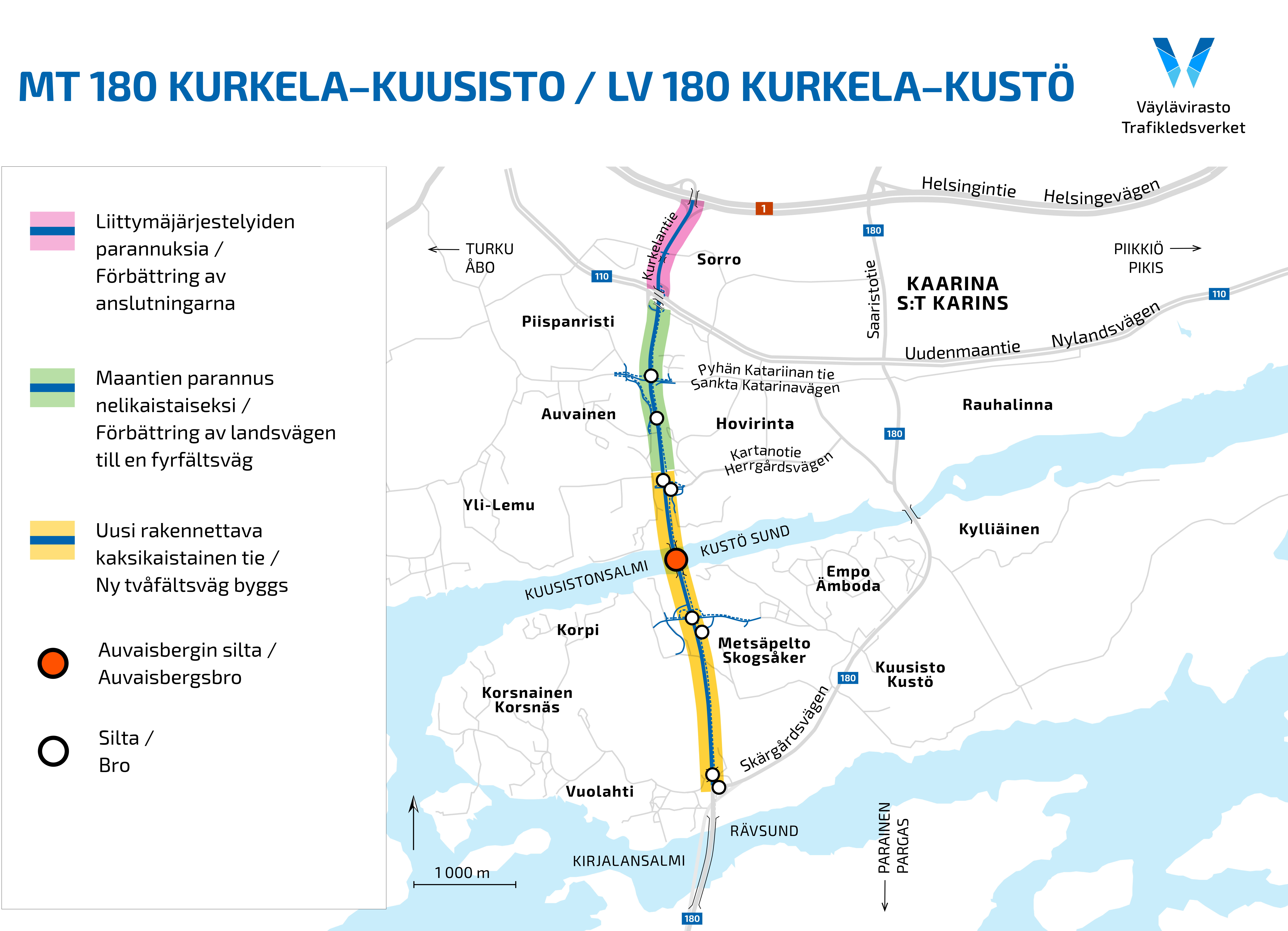 Ett viktigt mål för projektet Lv 180 Kurkela–Kustö är att säkerställa att den regionala vägförbindelsen löper smidigt och säkert. Genom de väg- och anslutningsarrangemang som genomförs inom projektet förbättras smidigheten i trafiken och trafiksäkerheten. Samtidigt stöds också utvecklingen av S:t Karins stads samhällsstruktur och markanvändning. I projektet byggs en ny sträckning för landsväg 180 i en ny terrängkorridor på cirka 3,5 kilometer, och landsvägen förbättras till en väg med två körbanor och fyra körfält väg på en cirka 1,3 kilometer lång sträcka. I projektet byggs eller förnyas nio landsvägsbroar, inklusive Auvaisbergsbron över Kustö sund. I projektet genomförs omfattande bullerskydd och grundförstärkningar samt lösningar för gång- och cykelleder samt arrangemang för enskilda vägar. Kostnadskalkylen för projektet uppgår till 114,4 miljoner euro.