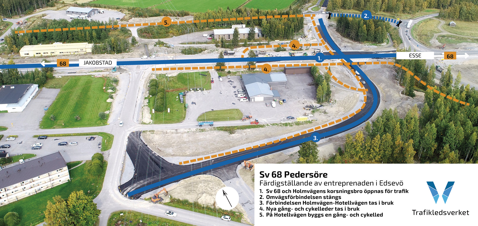 Under entreprenaden i Edsevö i Pedersöre, som inleddes i höstas i fjol, förbättrades den planskilda anslutningen mellan riksväg 8 och stamväg 68 och fortsatte längs Holmvägen från Granholmsbackens korsning till Hotellvägen under stamvägen. Vid korsningen mellan Holmvägen och stamvägen byggdes en ny viadukt. Dessutom har man i Edsevö byggt nya gång- och cykelvägar samt restaurerat Joksholms tunnel för gång- och cykeltrafik som går under riksväg 8.