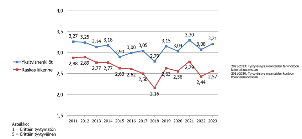 En undersökning som Trafikledsverket låtit göra visar att trafikanternas nöjdhet med vinterunderhållet av landsvägarna på alla delområden på riksnivå 2022–2023 steg till nästan samma nivå som tidigare. Man var igen nöjdare med vinterunderhållet av huvudvägarna än med vinterunderhållet av övriga vägar.