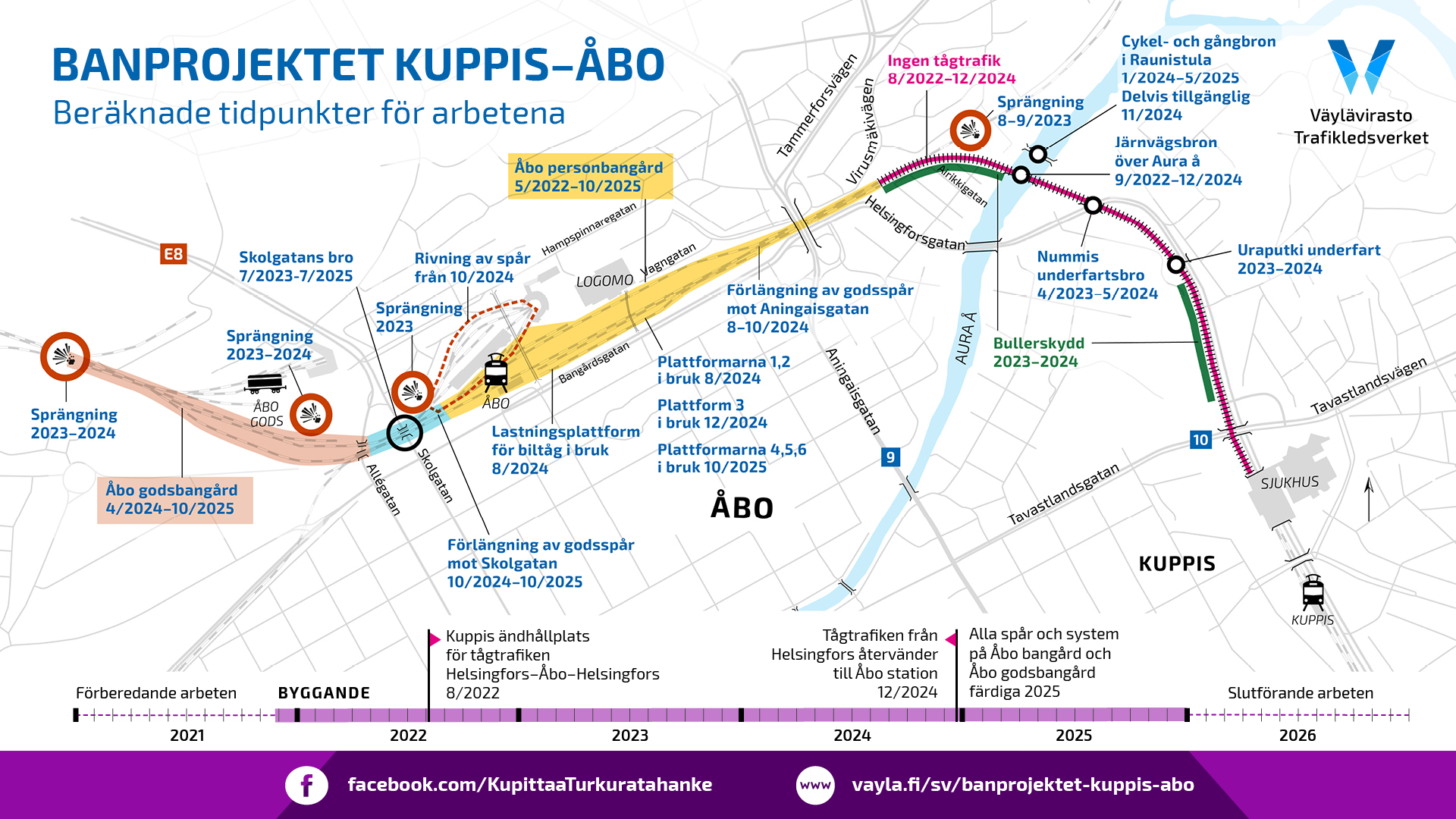 Uppskattad tidtabell för arbetena inom banprojektet Kuppis–Åbo på kartbilden.